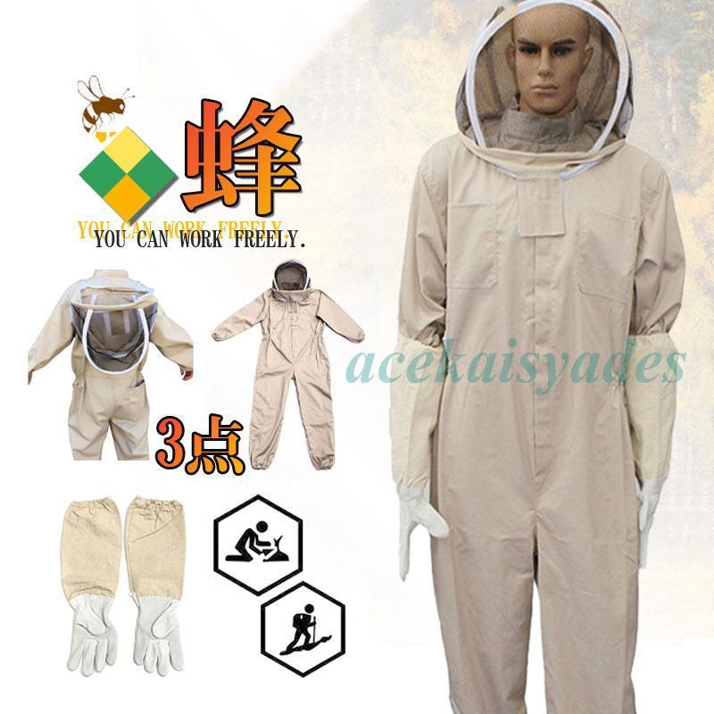 養蜂用 蜂防護服 3点セット 一体式 連体型 手袋付 フェイスネット付 蜂巣 害虫 駆除虫よけ ガーデニング 作業服 ハチ防護服 農作業 草刈り 防虫