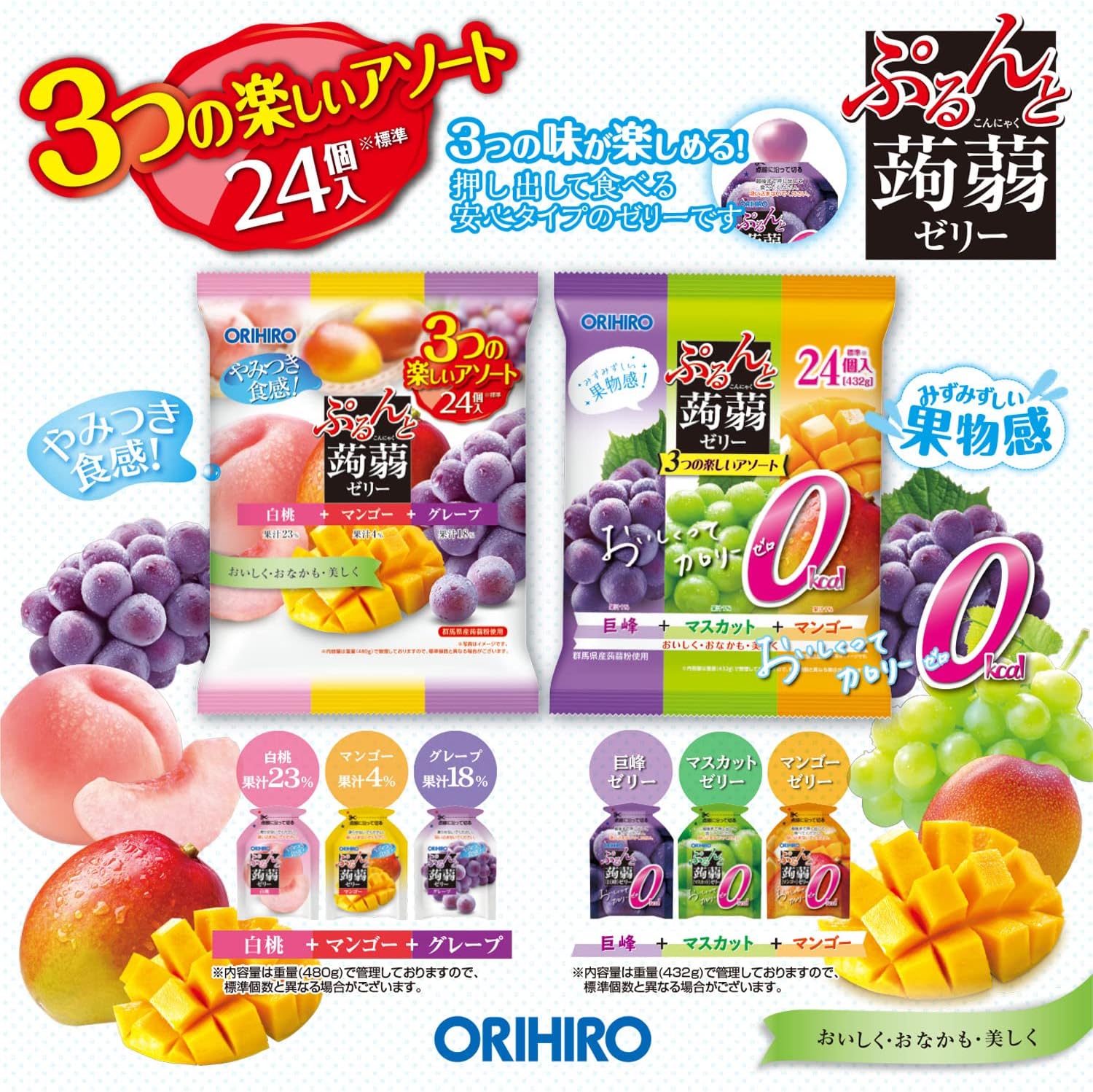 オリヒロ 6種 計48個 910g ぷるんと蒟蒻 こんにゃく ゼリー 大容量 詰め合わせ 白桃 マンゴー グレープ 巨峰 マスカット セット ギフト 家族 パーティー 持ち運び おかし お菓子