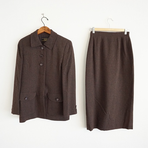 商品名(タイトル):#wnc レリアン Leilian スカートスーツ 7 茶 ツイード シルク混 ヘリンボーン レディース [828943]