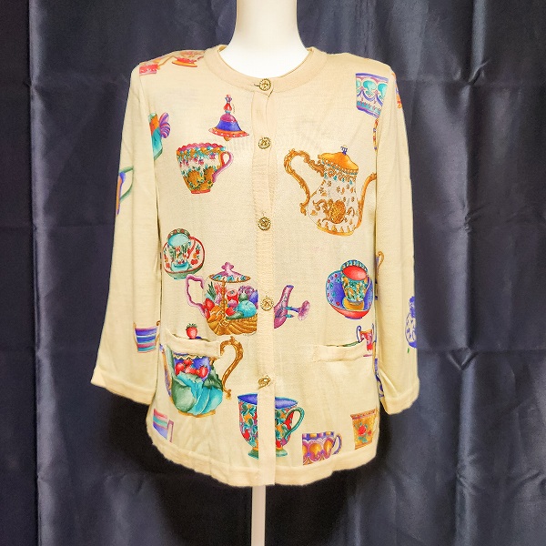 商品名(タイトル):#wnc レオナール LEONARD アンサンブル L ベージュ マルチ シルク混 金ボタン カップ柄 ポット柄 カーディガン ニット レディース [894921]