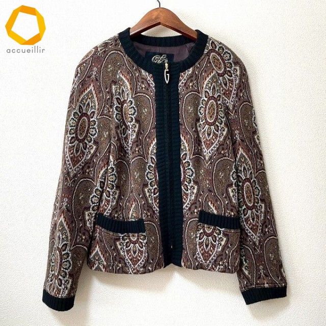 商品名(タイトル):#wnc イタリヤ 伊太利屋 ブルゾン ジャケット 11 黒 グレー マルチ ニット ペイズリー柄 ジップアップ レディース [989307]