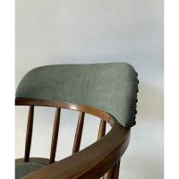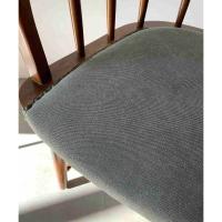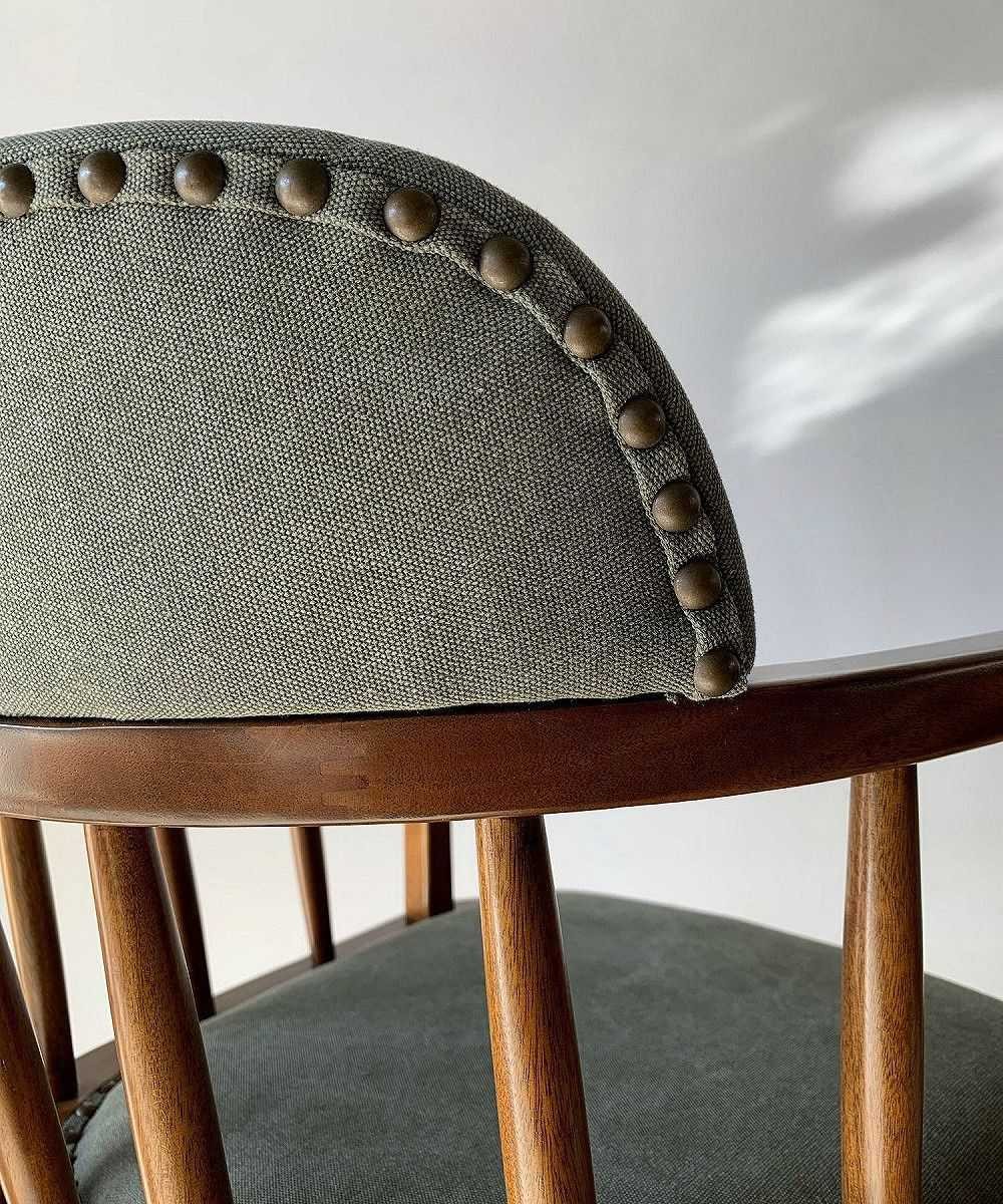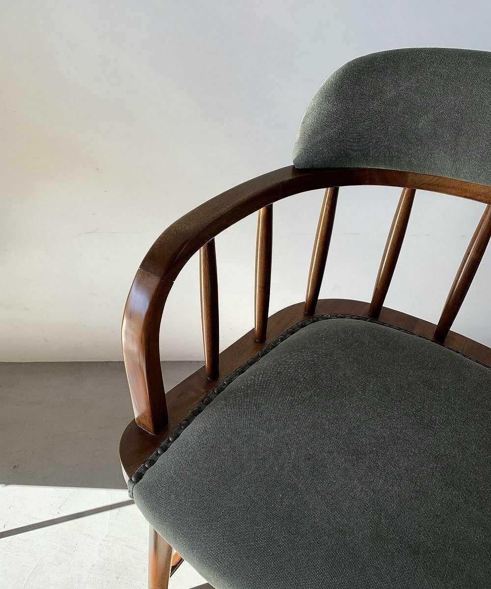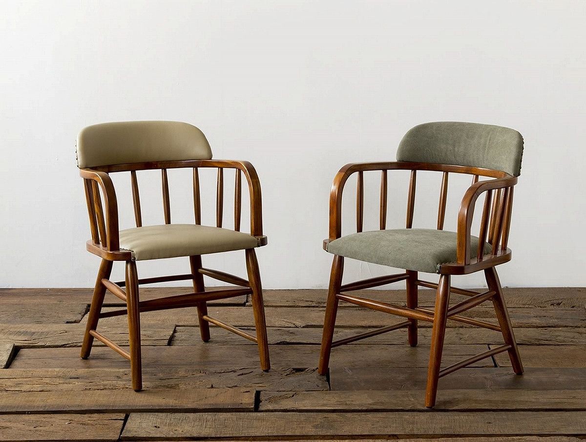 1908から1948年まで存在したアメリカ製のアームチェアをモチーフに、日本の住宅環境に合わせてリサイズしました。オリジナルは背、座面ともにウッドですが、こちらはクッション性を持たせるために背と座にウレタンを入れ、長時間座っても疲れないようにしています。ヴィンテージの美しいプロポーションを崩さずにサイズ変更をおこない、かつACMEのダイニングテーブルすべてに収まりが良いようアームの高さと幅を調整しました。どの角度から見ても遜色ない仕上がりです。ダイニングチェアとしてはもちろんのこと、デスクやリビングに置いてパーソナルチェア代わりにもおすすめです。