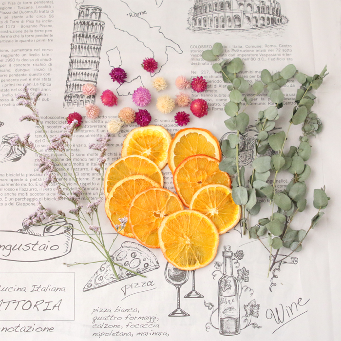 オリジナルのドライオレンジをたっぷり使用したドライフラワーの花材セットです!綺麗なドライオレンジが出来上がりました!一枚一枚丁寧に手作りしています。そんなドライオレンジ8枚+各花材をセットにした、オシャレな花材キットEをご紹介します。