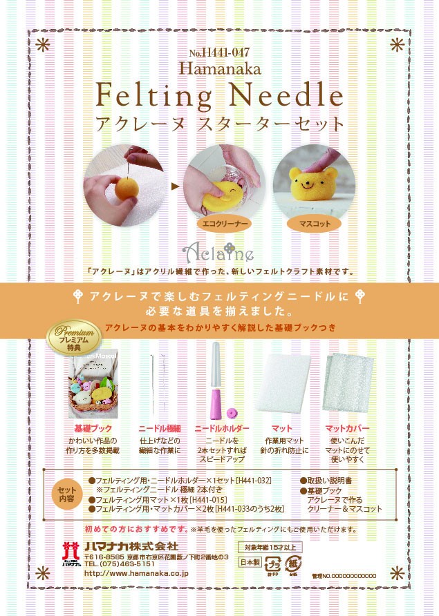セット内容:フェルティング用ニードルホルダー×1セット フェルティングニードル 極細2本付き(H441-032)、フェルティング用マット×1枚(H441-015)、フェルティング用・マットカバー×2枚(H441-033のうち2枚)、取扱い説明書、基礎ブック アクレーヌで作るクリーナー&マスコット