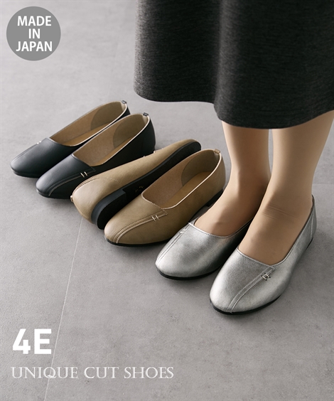 【コメント】フロントのカッティングデザインがワンポイント!軽く、底周りに屈曲性を持たせているので歩きやすい。ラウンドトゥのころんとしたつま先は合わせるコーディネートを選びません。つい手がのびるベーシックカラーのブラックとグレージュに加え、意外にも様々なスタイルに合わせやすいシルバーをご用意しました。屈曲性のあるソールが足裏の動きに沿って曲がるので歩きやすい、軽量仕様で楽ちん、柔らかく足当たりの優しい素材を使用しています。甲高・幅広・ふっくら足さん、足のお悩みをお持ちの方が心地よく履いていただけるよう設計しています。