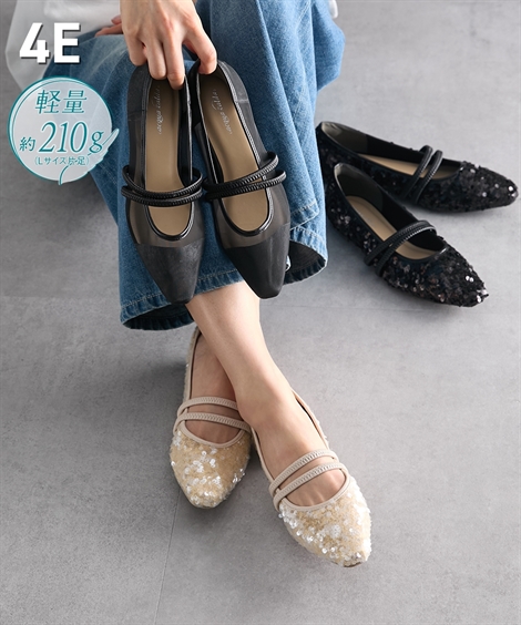 【素材】材質=合成繊維・合成皮革 底材=合成底 ヒール=約1cm ワイズ=4E 重量=約210g(4E:Lサイズ片足) ※生産時期や素材などによって多少個体差があります。 ※飾りは繊細なため強い衝撃によっては取れる可能性があります。 ※素材の特性上、引っ掛かりやすくなっていますので、ご注意してください。