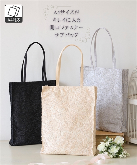 コメントフォーマルシーンに最適な、A4サイズが入るファスナー開閉のサブバッグ。折り畳むことが出来る生地で、使用しない時にはメインのバッグに収納する事も出来るので、持ち運びにも便利です。サテン地にレースをあしらった高見えバッグ。案内状なども折りたたまずに入りA4サイズも入るサイズです。マチ幅がしっかりあるサブバッグとしてはもちろん、折り畳んでメインバッグに収納&持ち運びに便利です。スマホなど収納可能な大きめサイズの内ポケット1個付きです。