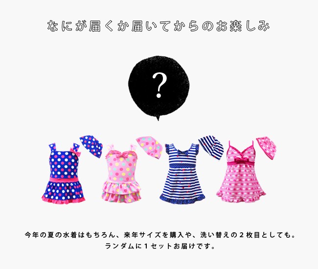 元気なキッズにぴったりのドット柄やチェリー柄、少し背伸びしたようなパステルカラーまで様々な水着をご用意しました。ワンピースタイプの水着にはおそろいのキャップもついてきます。今年の夏の水着はもちろん、来年サイズを購入や、洗い替えの2枚目としても。ランダムに1セットお届けです。なにが届くかはお楽しみに!