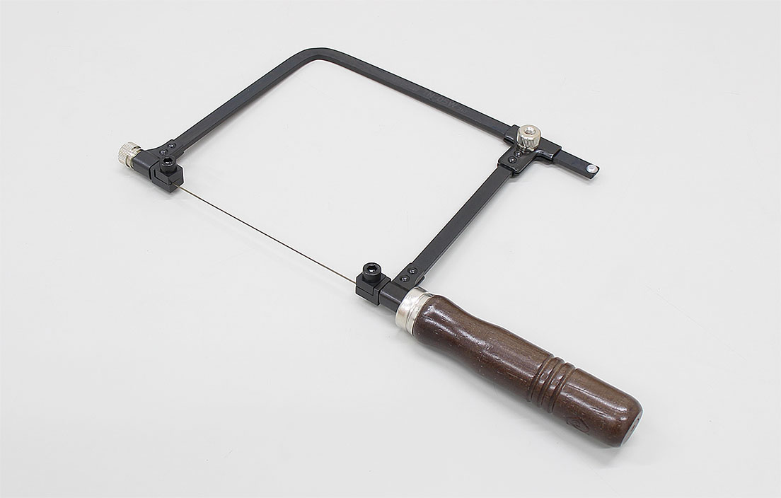 曲線や窓抜きなど自由な形状に切断できる糸鋸。フレームの長さが調整できる自在型です。