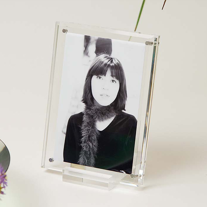 マグネット固定タイプの重厚感溢れるアクリル写真立て。斜めカットされた厚板が高級感を演出します。