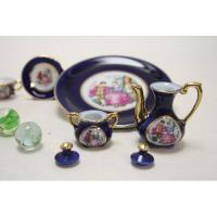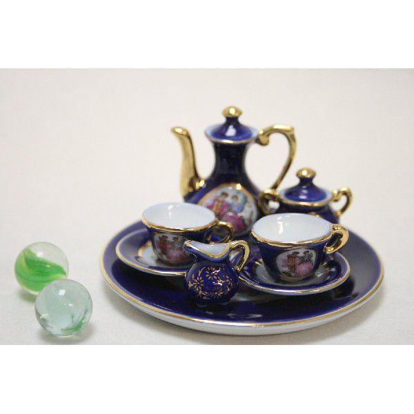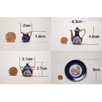 ミニチュア陶器ブルーカラーのティーセットです。 サイズ :カップ 2.3cm×2.8cm 高 1.5cmソーサー:3.6cm 高さ0.6cm ポット:4.3cm×3cm 高4.6cm シュガー:3.1cm×2.3cm 高2.7cm クリーマー:2cm×1.6cm 高1.9cm デコーレートトレー:9cm 高0.7cm 小さい陶器ですので3歳以下のお子様には与えないようにお願いします。