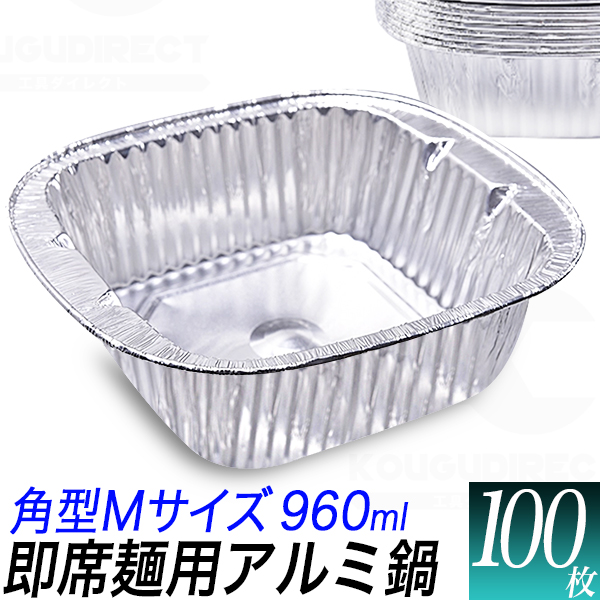 ■アルミ容器 角型Mサイズ 960ml 100枚セット 即席ラーメン用 一人鍋に縦 180mm x 横 190mm x 高さ 55mm 底 130mm x 130mm 厚さ 0.065mm重量 : 約 9g/枚素材 : アルミ容量 : 約 960mlIHコンロで調理が可能なアルミ容器です。四角い即席麺を調理するのに適しています。ガスコンロ、カセットコンロ、IHコンロでの火力設定は、「中火」以下でご使用ください。※熱で多少変色しますが、家庭用のアルミ箔と同じ材料で出来ています。有害な物質は出しません。※電子レンジの使用は出来ません。使い捨てです。手間なく、ご自宅で調理する際にご使用ください。使用後は燃えないゴミとして処分でき、衛生的です。ひとり鍋にもちょうど良いサイズ。アウトドアや、ホームパーティー、ケータリングなどで重宝する、使い捨てアルミホイルです。アルミ鍋使用可のものであれば、IHコンロでも使用できます。おすすめの使い方。電気ケトルでお湯を作る。→アルミ容器にお湯を注ぐ。→コンロで加熱し、麺を入れほぐす。この方法ですと、とても短時間で調理出来ます。この商品は、食品衛生法に適合し、さらに独自に弊社で耐久試験しています。梱包には十分注意しておりますが、商品の性質上、お届けの最中に、多少ゆがみや、容器が変形する場合がございます。ご使用には差し支えありませんので、ご了承ください。アルミ容器、アルミ皿、アルミ箔、アルミ鍋、ラーメン用アルミホイル鍋、アルミホイール鍋 エコ容器 角型容器