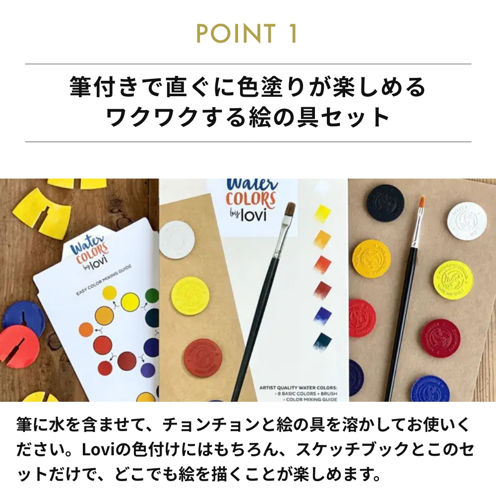 筆付きで直ぐに色塗りが楽しめるワクワクする絵の具セット。筆に水を含ませて、チョンチョンと絵の具を溶かしてお使いください。Loviの色付けにはもちろん、スケッチブックとこのセットだけで、どこでも絵を描くことが楽しめます。