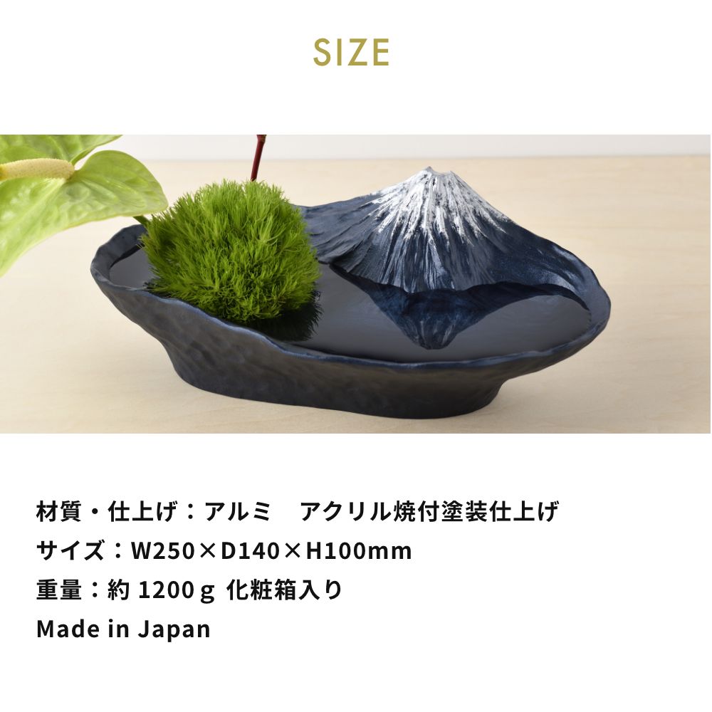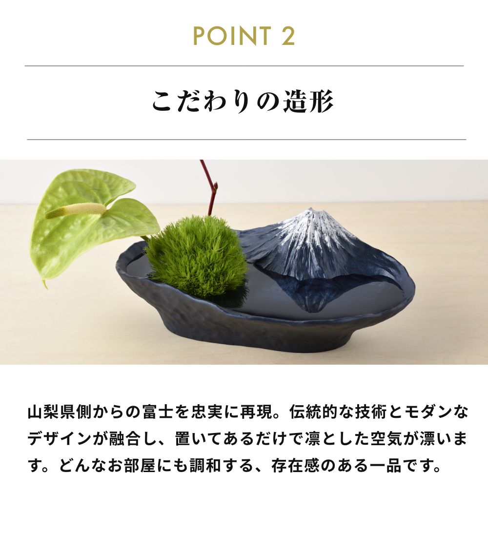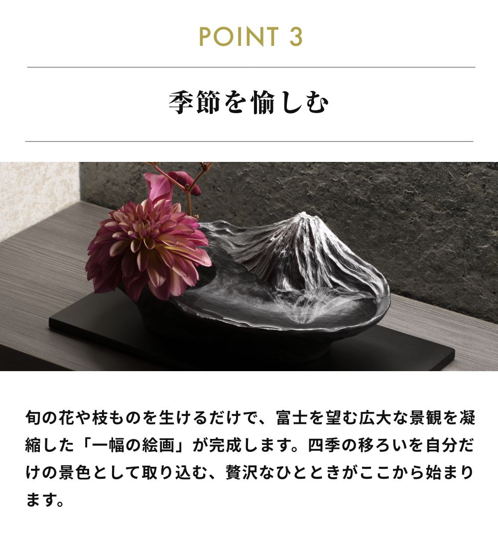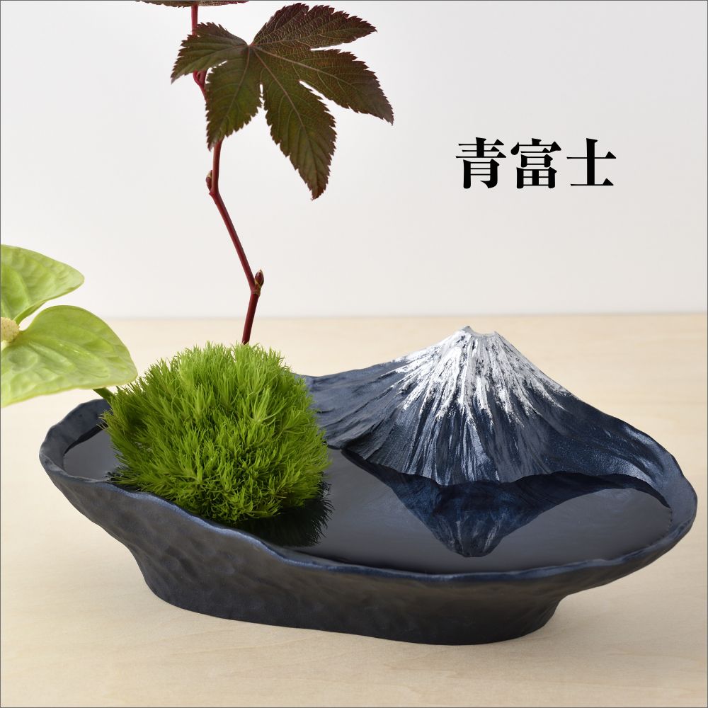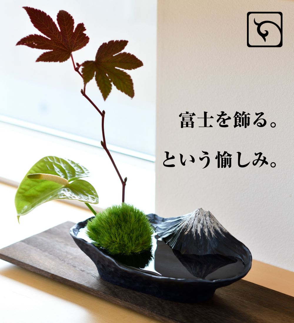 季節の花や枝ものを生けると、富士山を望む景観を凝縮したかのように感じられる水盤型の花器。
