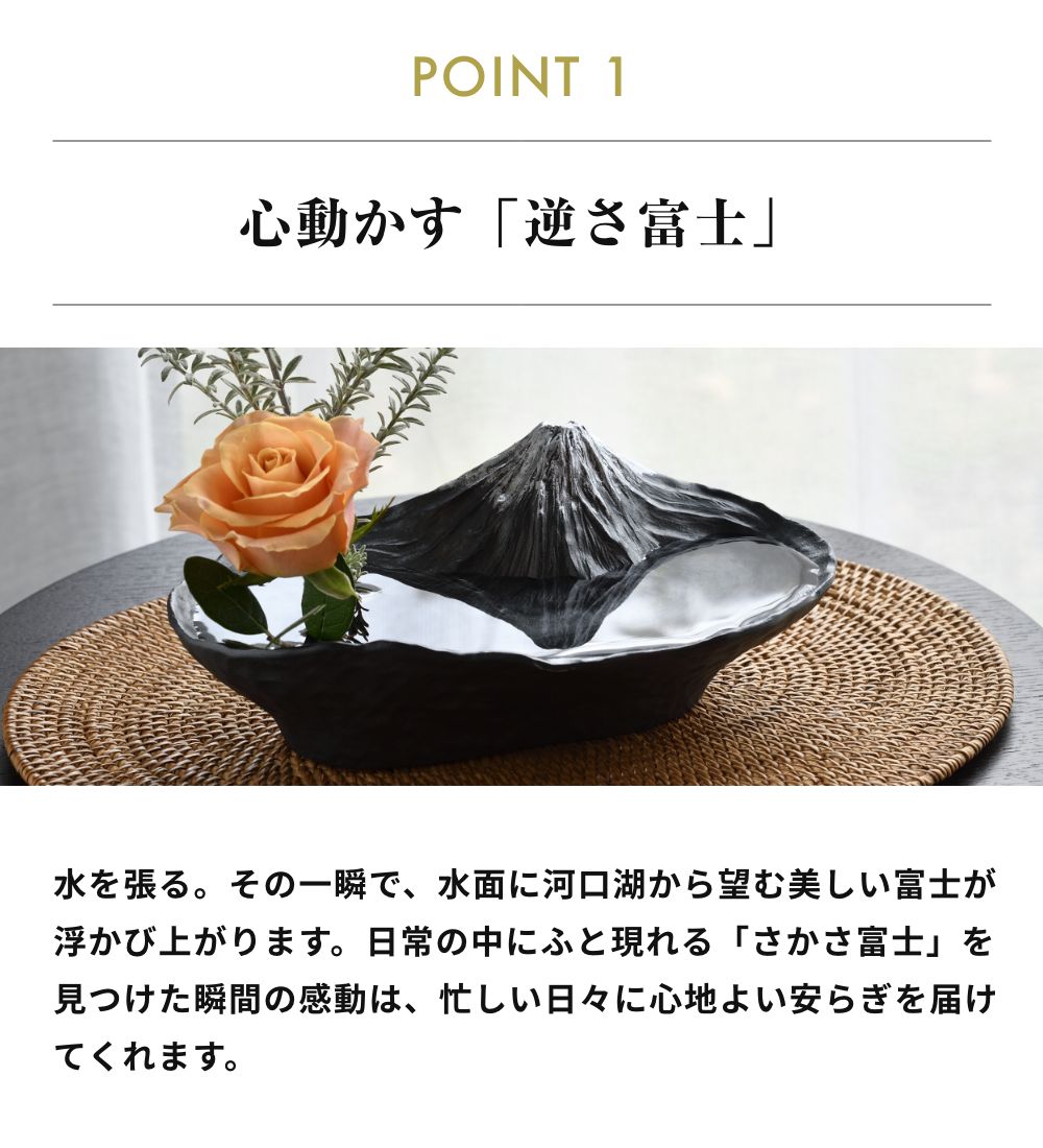 日本を代表する景勝地「富士山」の風景をモチーフにした、水面にさかさ富士。