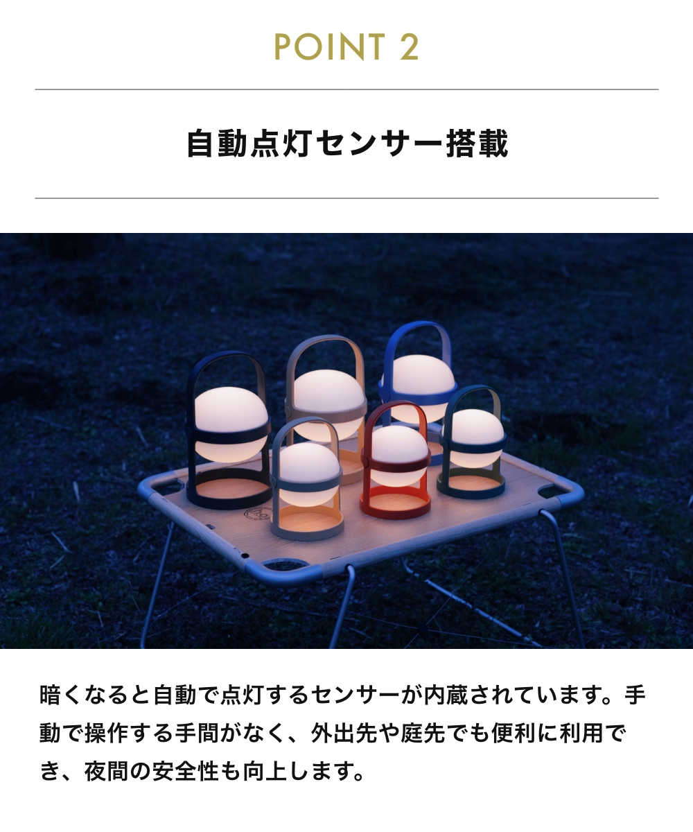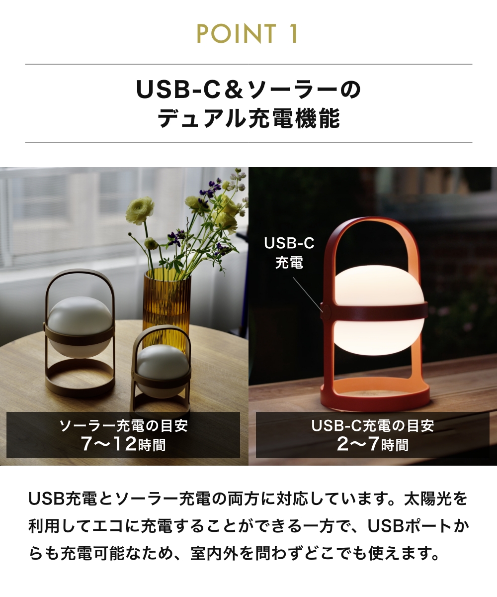 ・太陽光またはUSB Type-Cによるフル充電で約19時間点灯します。