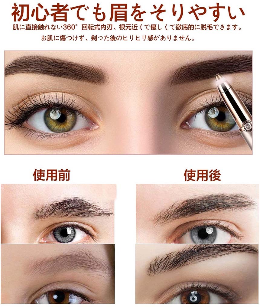 【肌を傷つけない&痛くない】普通の眉毛シェーバーと違いって、こちらの眉毛シェーバーは最新型360°盲点がない電動回転式内刃を採用し、お肌を傷つけにくいです。初心者や肌の損傷を気になる方に最適です。