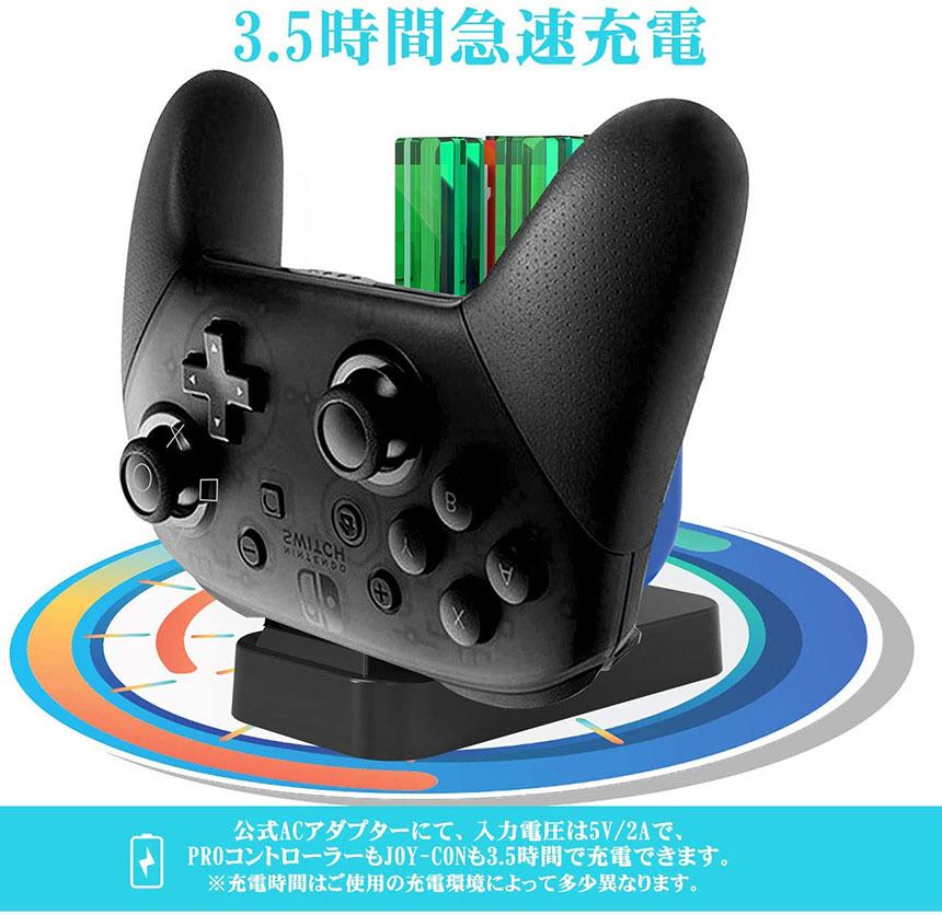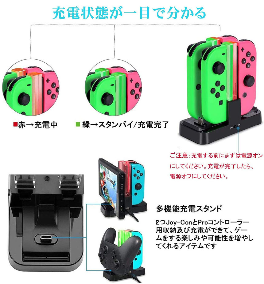 Joy-Con&Proコントローラー用収納及び充電ができて、ゲームをする楽しみや可能性を増やしてくれるアイテムである。休みの時、家族・仲間と一緒PLAYする際の充電可能です。