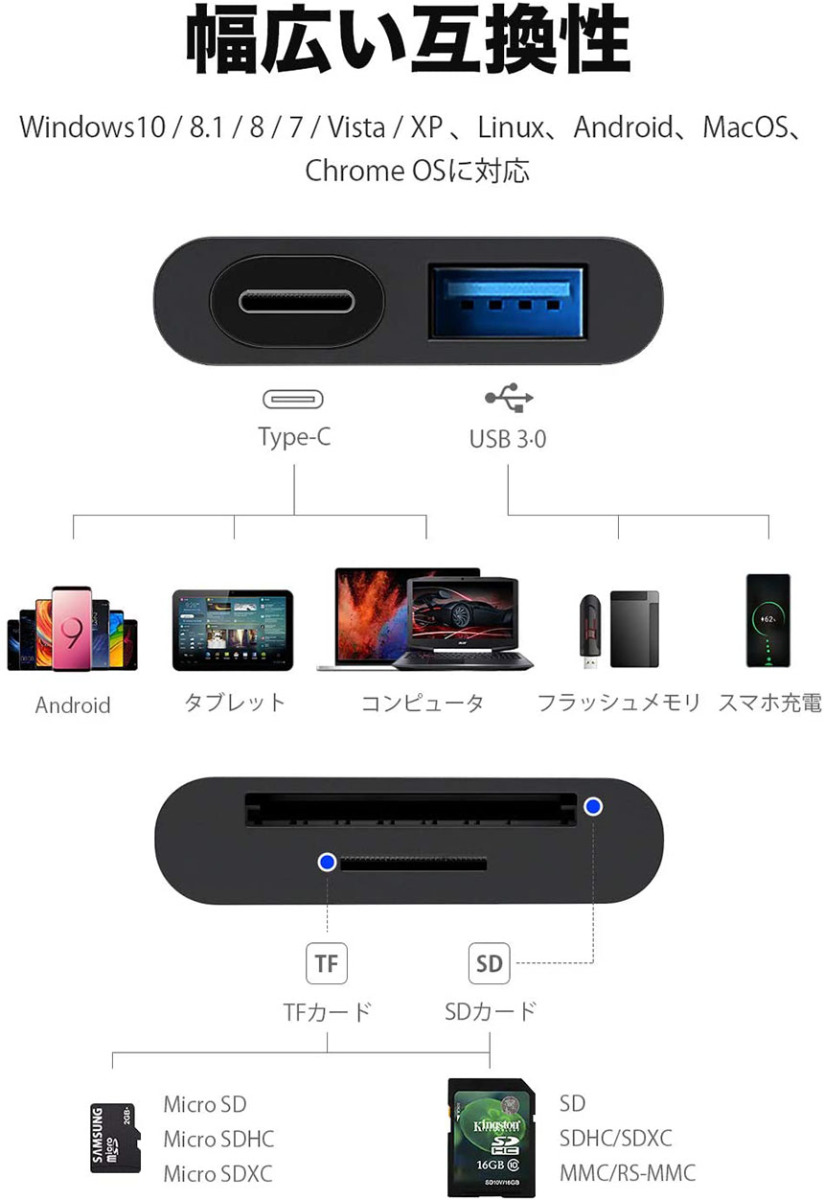 【幅広い互換性】Windows XP / Vista / 7/8 / 8.1 / 10、Mac OS、Linux、Chrome OS等多種類のシステムに適用します。【USBポートあり】USBポートが付いていて、USB 3.0→Type-Cの変換アダプタのように使用することができます。USBフラッシュメモリを挿入後、直接スマホでデータを読み取れます。また、USBポートとスマホを接続するとスマホに充電可能です。※スマホに充電する時に電源を入れるかどうかをご確認ください。