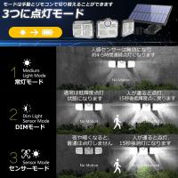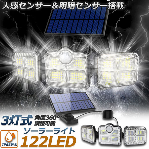 【122LED・3面発光・300°照明】 屋外ソーラーライトには800ルーメンを備えた122個のLEDチップが搭載しております。夜間の活動の安全性を確保するために、夜間により強い光を提供できます。3面発光のデザインで照明角度が300°に達すだけでなく、両側のライトは上下左右150°回転することができますから、照明が必要な場所で照明角度を自由に変えられます。ラーパネルの部分は上下左右150°の角度に調節できますので、太陽の良く当たる方へ向けられ、十分にソーラー充電できます。センサー検知角度が120°になりましたので、夜の防犯灯としてもすごく実用です。
