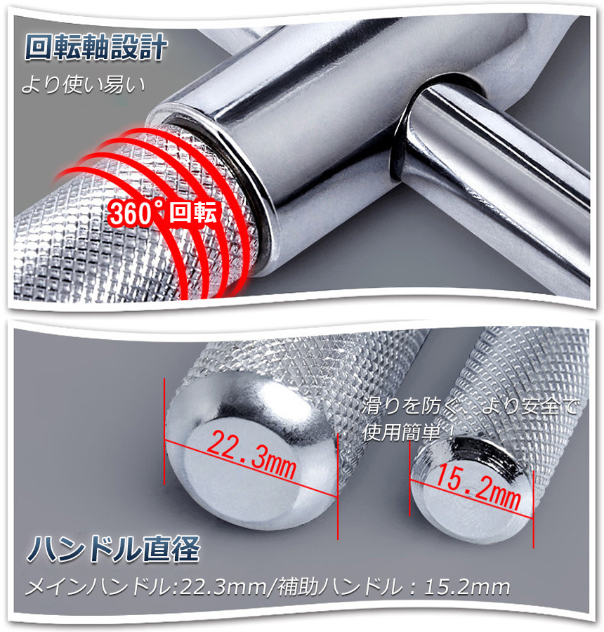 回転軸とハンドルバーを同軸に配置することで、バー同士を溶接した一般的な十字レンチよりもブレの無いスムーズな回転が可能です。