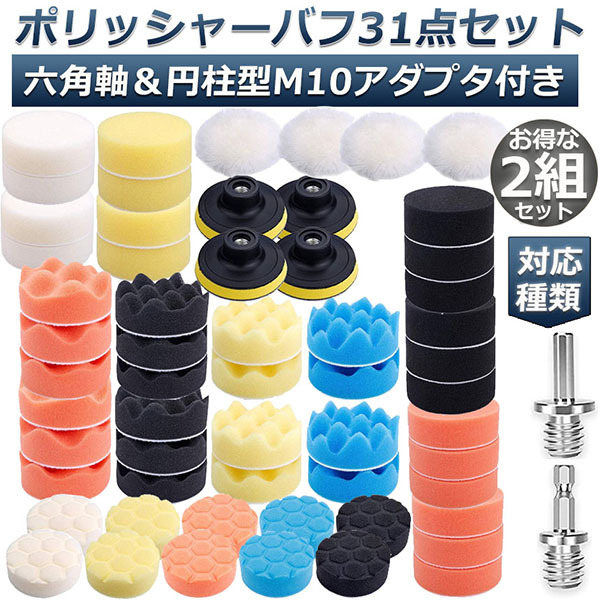 【31点セット内容】25枚8cm研磨スポンジパッド、2枚ウールパッド、2個ドリルアダプタ(六角軸付き)、2個吸着盤が含まれます。直径:8cm。
