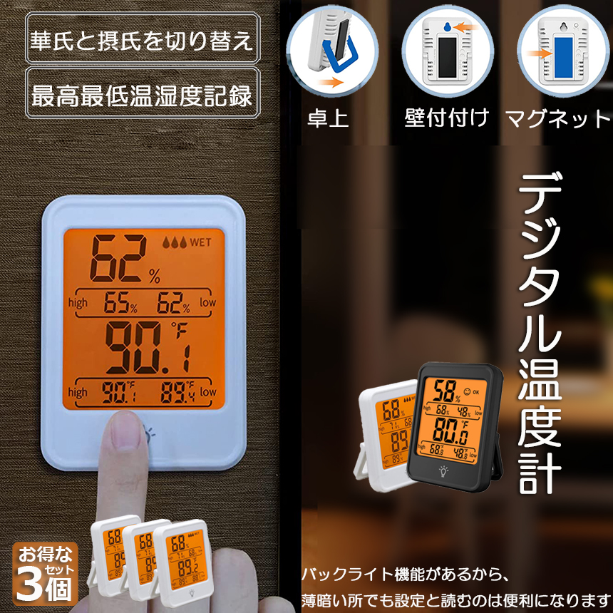 デジタル温度湿計 温度計 湿度計 大型液晶 マグネット 3個セット 温湿度計 LCD大画面 単4電池 置き掛け兼用 卓上 壁掛け 華氏 摂