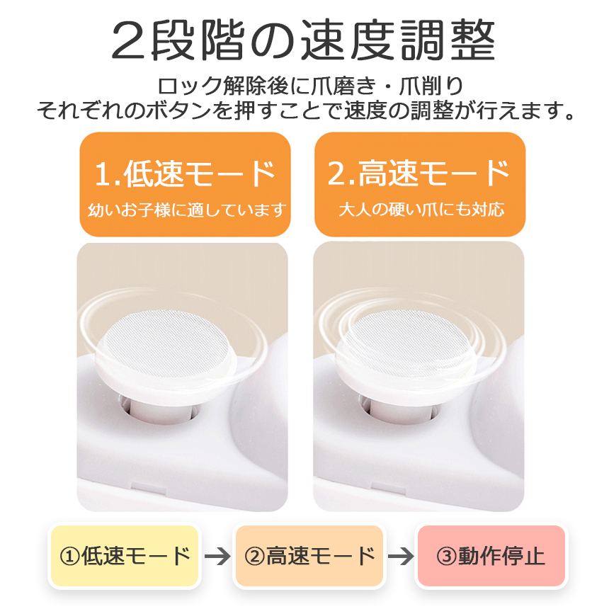 赤ちゃんの柔らかい爪は低速モード、大人や高齢者の硬い爪は高速モードで用途によって使い分けてお使いください。
