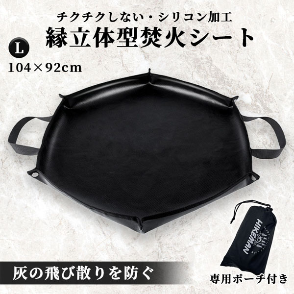 【縁あり焚き火シート】焚き火やキャンプ、バーベキューなどのアウトドアに!灰が散らない便利な焚き火シートです。シートの外周にあるボタンを止めることで灰の飛び散り防止が行えます。次に使用する人のためにもキャンプ場を汚さずキレイなまま利用できます♪【シリコン加工】両面シリコン加工だから従来の焚き火シートと違いチクチクしない!シートに落ちた灰を拭き取るだけで掃除ができます。【便利な持ち手付き】シートの周囲に持ち手が付いているので、薪や軍手などの素材を包んで持ち運びのために利用することもできます。【折りたたんでコンパクト】シートを折りたたむとコンパクトに収納できます。専用ポーチも付属しているので持ち運びにも便利です♪