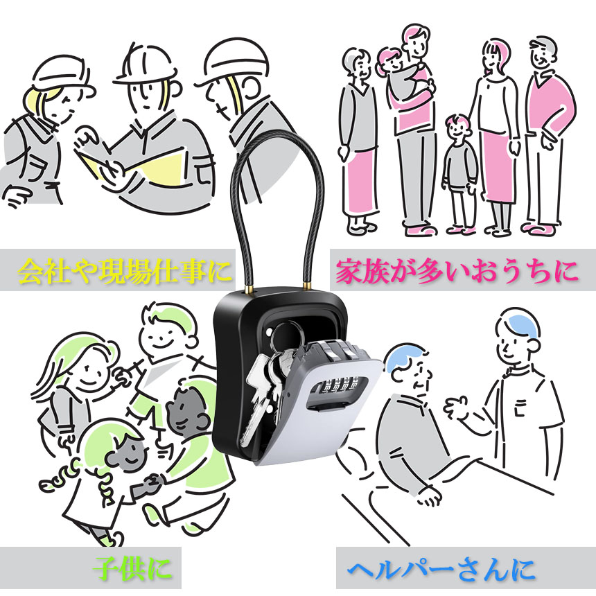 鍵を忘れて、自宅に帰れなかったり、または他人と鍵や物品などを共有したかったりする時に役に立つ新商品ー鍵ボックスです。鍵を入れて、必要なところに設置します。暗証番号を入力すれば、鍵を取り出して即座に使えます。職場や家庭、会社等の場所で鍵や物品の保管・受け渡しがとても便利になります。