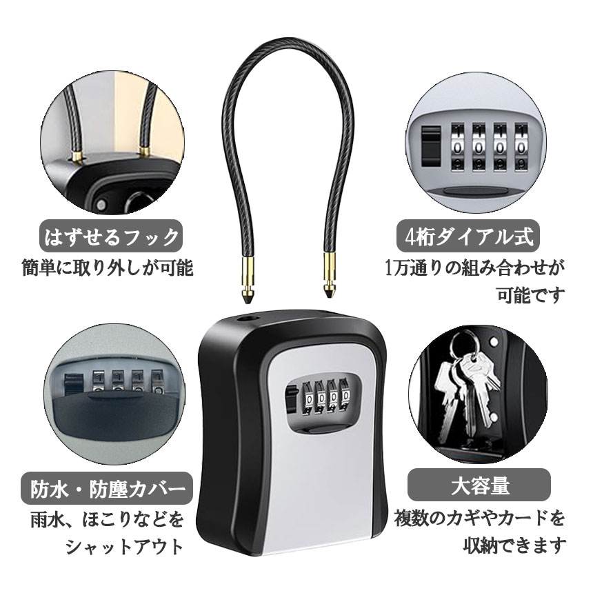 【耐久性のある素材】このキーボックスは亜鉛合金とプラスチックで作られており、ハンマー、のこぎりなどからボックスを保護することができます。また、体に無害な環境に優しい塗料を使用しています。【高いセキュリティ】4段式ダイヤルなので、10000通りの設定番号から好きな組み合わせを選べます。4桁ダイヤル式設計は3桁より10倍高いの安全性を確保します。4桁の組み合わせは覚えやすく、リセットするのが簡単です。キーなどは紛失して開けられなくなる心配がありません。本体内部に収納できるため、外側から収納物が見えなく、屋外に取り付けても安心してご使用いただけます。 (注: パスワードをリセットした後は、写真を撮るか、メモを取ることをお勧めします)【鍵の管理、共有対策】鍵を忘れて、自宅に帰れなかったり、または他人と鍵や物品などを共有したかったりする時に役に立つ新商品ー鍵ボックスです。鍵を入れて、必要なところに設置します。暗証番号を入力すれば、鍵を取り出して即座に使えます。職場や家庭、会社等の場所で鍵や物品の保管・受け渡しがとても便利になります。