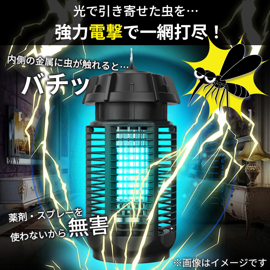 【光で誘引・電気で撃退】虫が寄ってきやすいとされる365nmの波長のUVライトを利用し虫を誘引。寄ってきた虫が内側の金属棒に振れると感電して殺虫!殺虫剤やスプレーを使用せず駆除できるので、無害かつ環境にも優しい商品です。