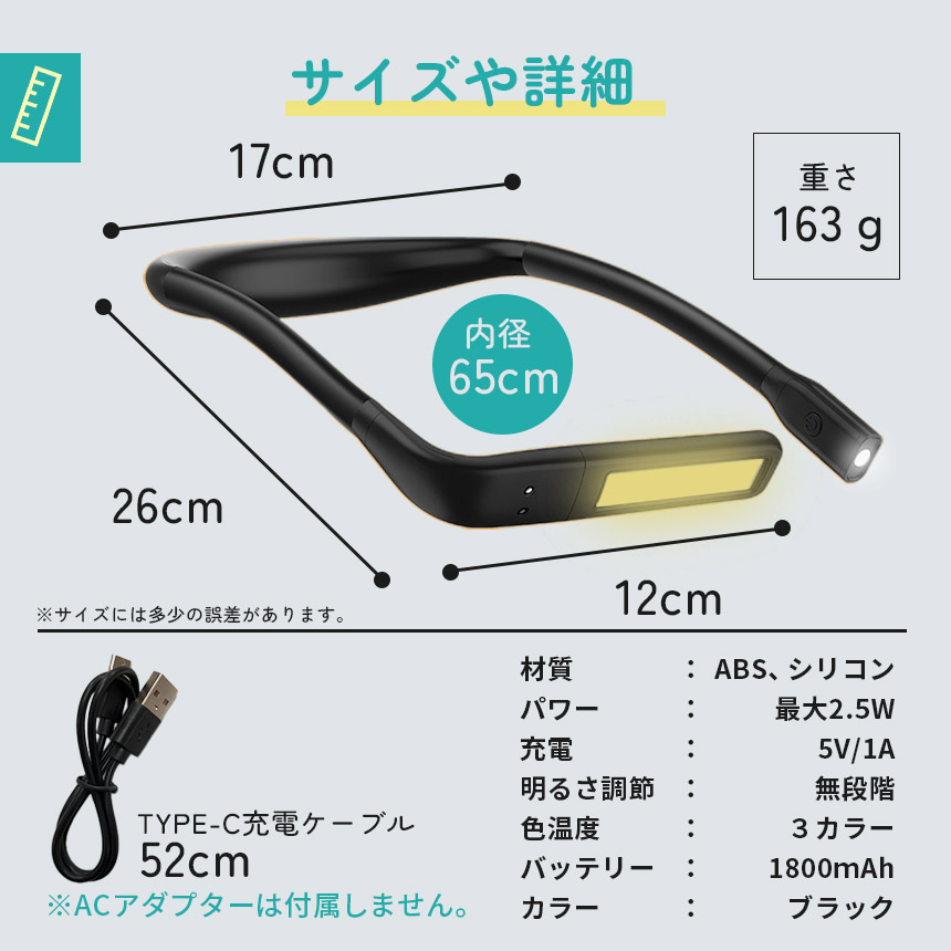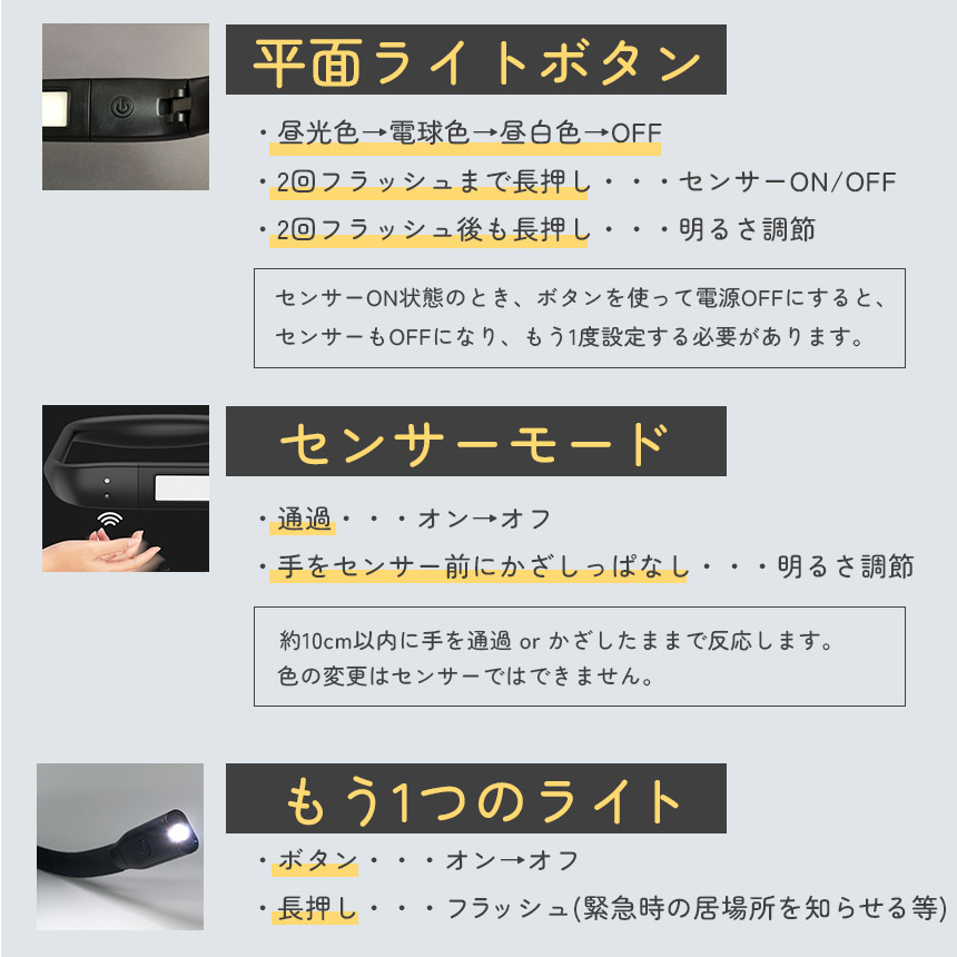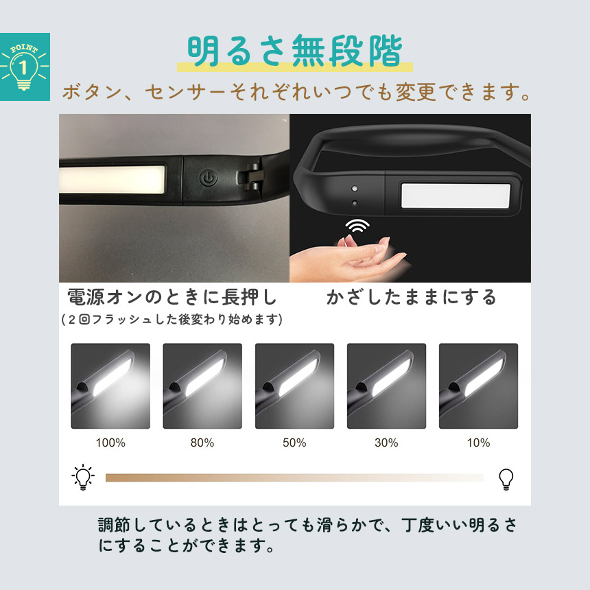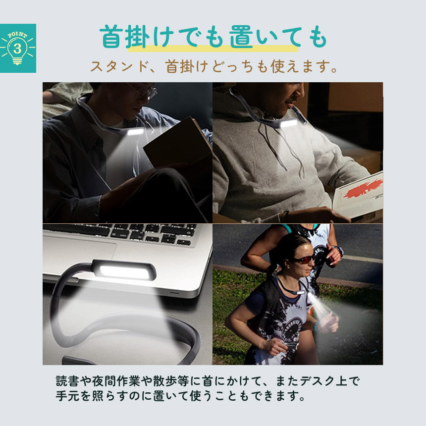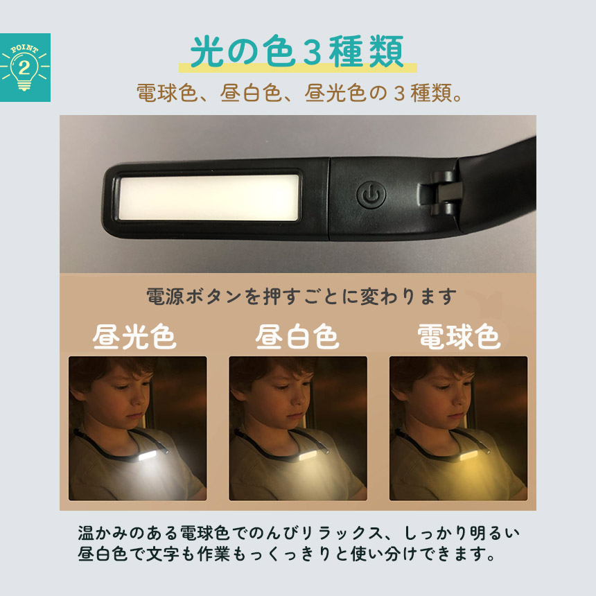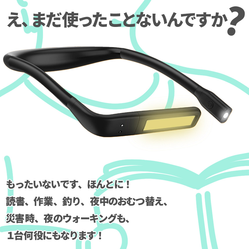近くも遠くもこれ一つ♪ハンズフリーで操作できる「ネックライト」です!【使い道たくさんで自由自在!】読書、散歩、夜間作業、深夜のおむつ替え、懐中電灯、勉強、釣り、車の修理、キャンプやアウトドア等々、これ一つで使い道がたくさん!近くと遠くを照らせる2つのライトがついています。可動域も広くお好きな角度にすぐ調節可能です。もちろんスタンドとして置いても、ちょっと照らしたいときのライトとしても用途多彩で自由に使えます♪【無段階調光&3色】環境に合わせて細かく明るさ調節可能です。また、3色の色の変更もできるので、優しくオレンジに、しっかり白で明るく、またその中間で、と簡単に変更できます。