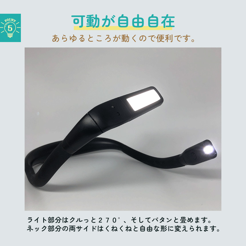 読書、散歩、夜間作業、深夜のおむつ替え、懐中電灯、勉強、釣り、車の修理、キャンプやアウトドア等々、これ一つで使い道がたくさん!近くと遠くを照らせる2つのライトがついています。可動域も広くお好きな角度にすぐ調節可能です。もちろんスタンドとして置いても、ちょっと照らしたいときのライトとしても用途多彩で自由に使えます♪