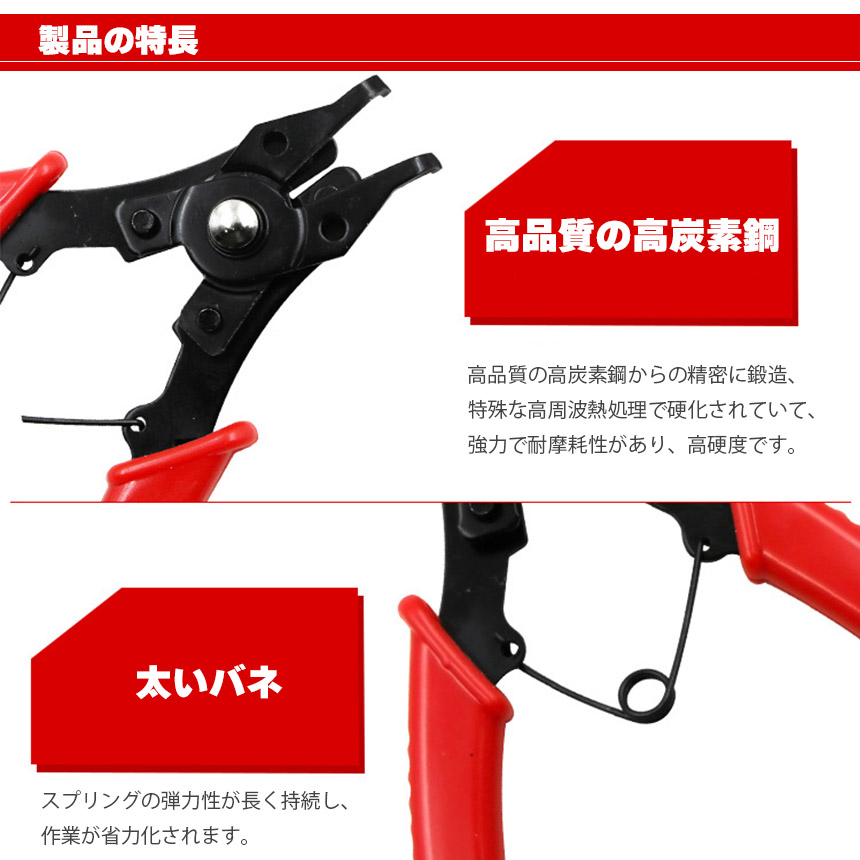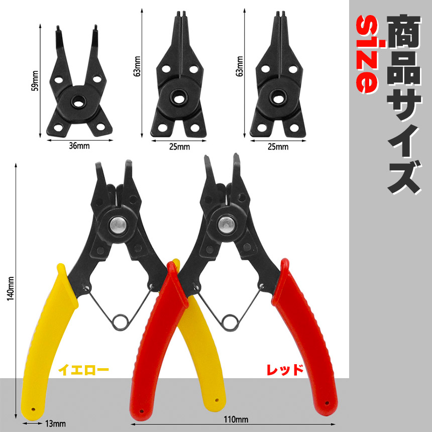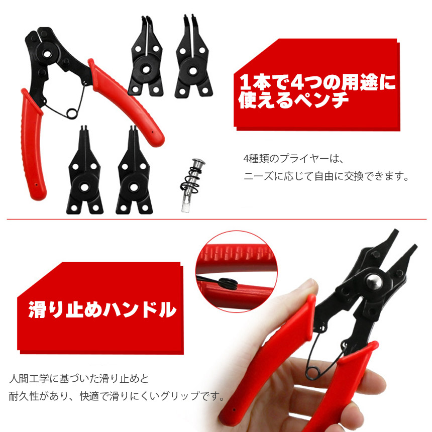 ◎軸・穴両用スナップリングプライヤー◎【素材】高品質の高炭素鋼からの精密に鍛造、特殊な高周波熱処理で硬化されていて、強力で耐摩耗性があり、高硬度です。【1セット内容】本体×1、交換用ヘッド×4【サイズ】約110x140mm(ヘッドを取り付けた全体。)※多少誤差があります。