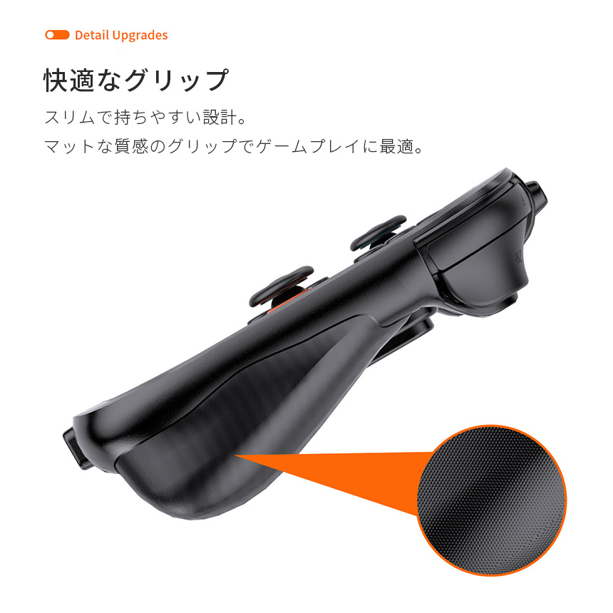 持ちやすい形状とマット素材で、快適にプレイできるよう拘っています。表面に細かいテクスチャーを入れることにより、滑り止め効果とべたつきを軽減。