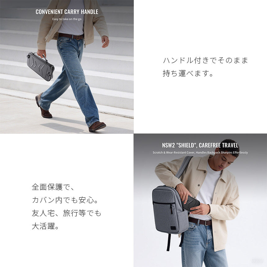 軽くて丈夫なTPU&ABS素材を使ったケースなので、軽量ながらも耐久性があります。画面側カバーを外したら、本体を守りつつそのままゲームプレイできます。屋内保管はもちろん、旅行や友達の家、持ち運びにも大活躍!