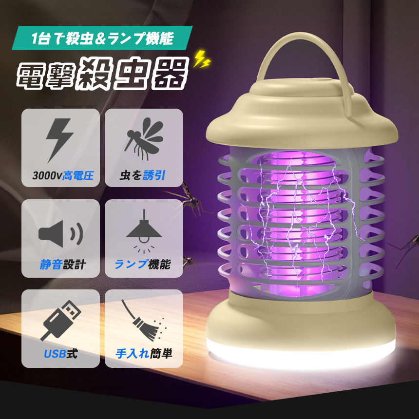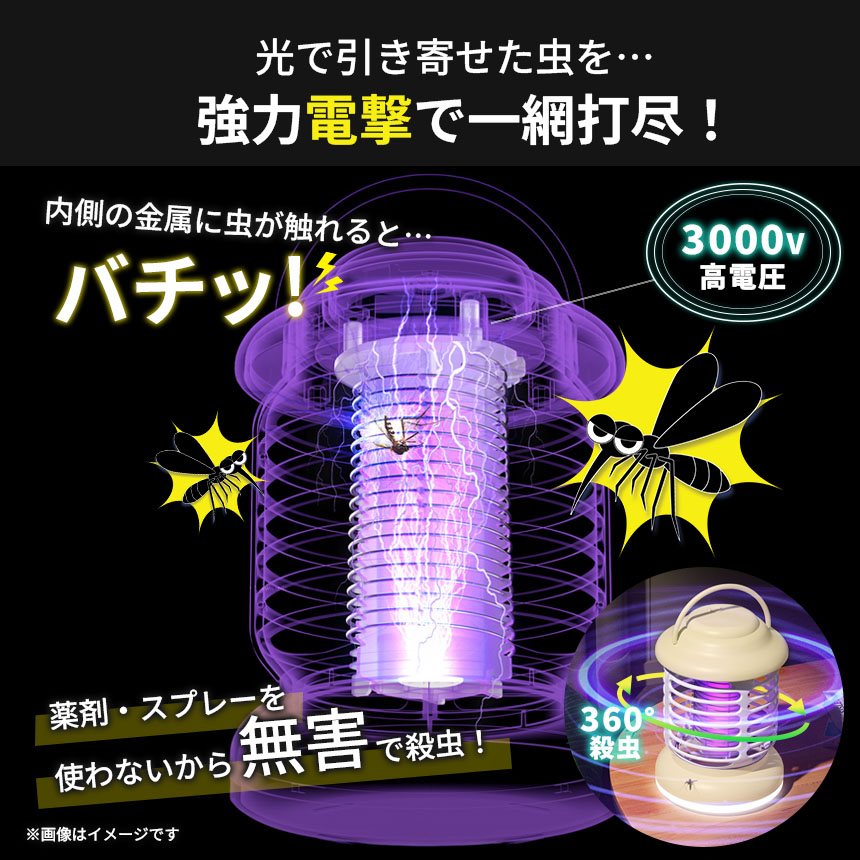 ●1台で殺虫&ランプ機能 電撃殺虫器●【光で引き寄せた虫を強力電撃で一網打尽!】内側の金属に虫が触れると、バチッ!と3000Vの高電圧で360度全方位で殺虫します。薬剤・スプレーを使わないので、お子様やペットがいるご家庭でも安心してご使用いただけます。