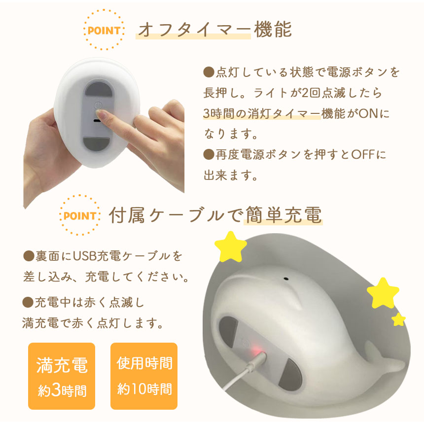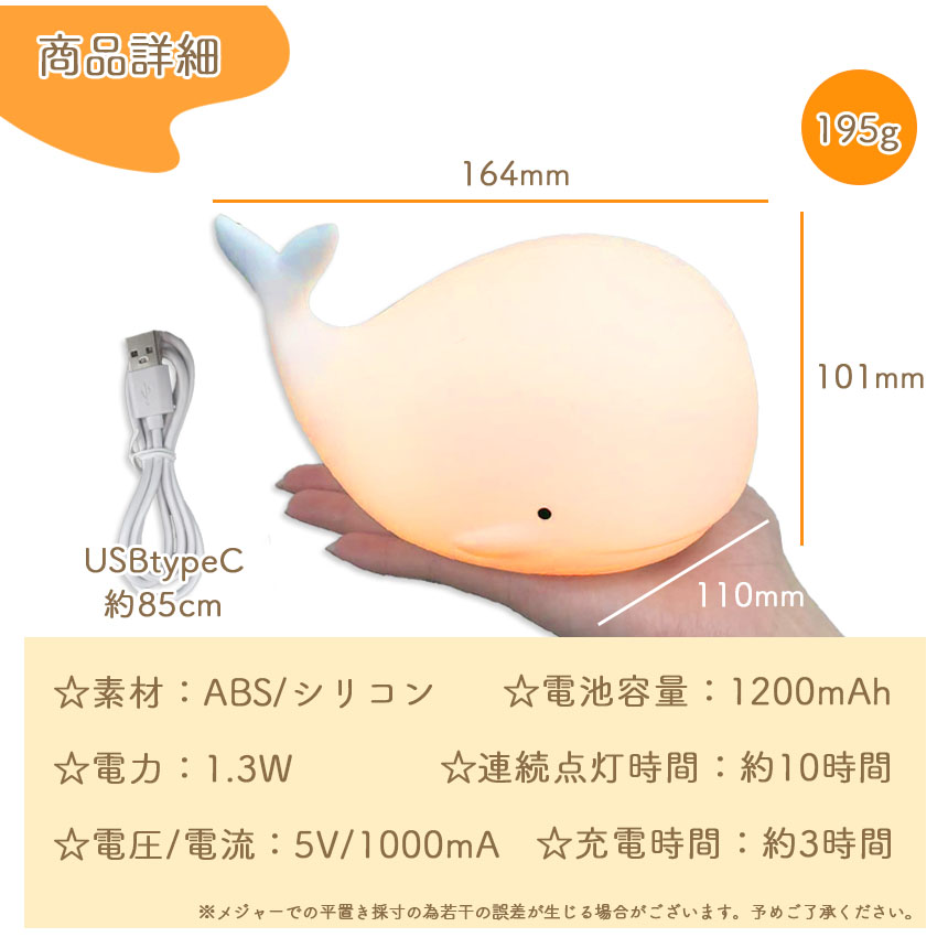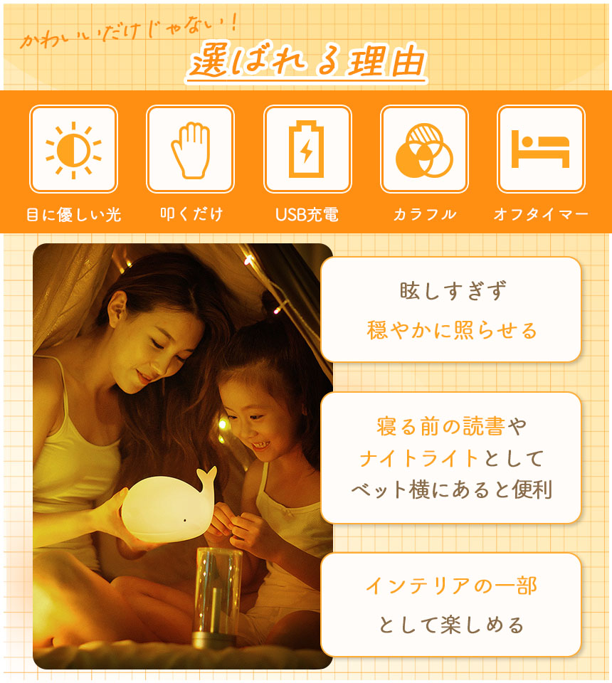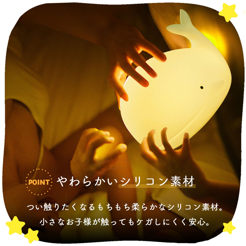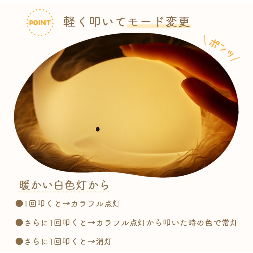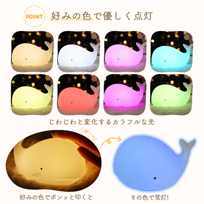<柔らかい光のくじら型ルームライト>ベット際におすすめのアイテム◎■おすすめポイント!目に優しい柔らかい光タッチ点灯USB充電カラフルなライトオフタイマー
