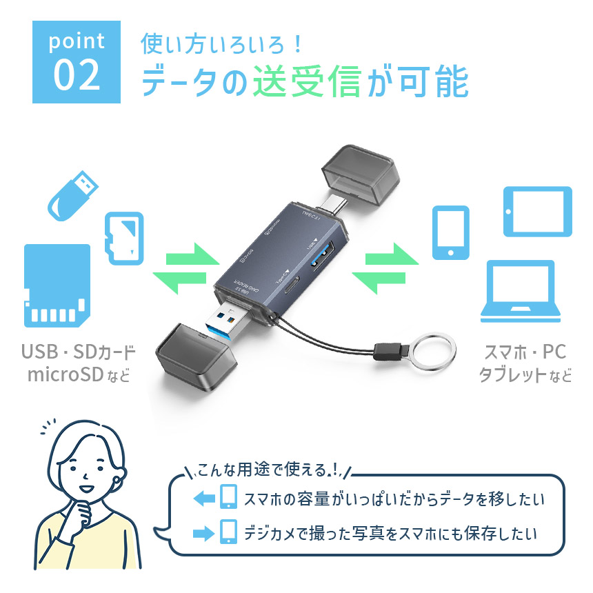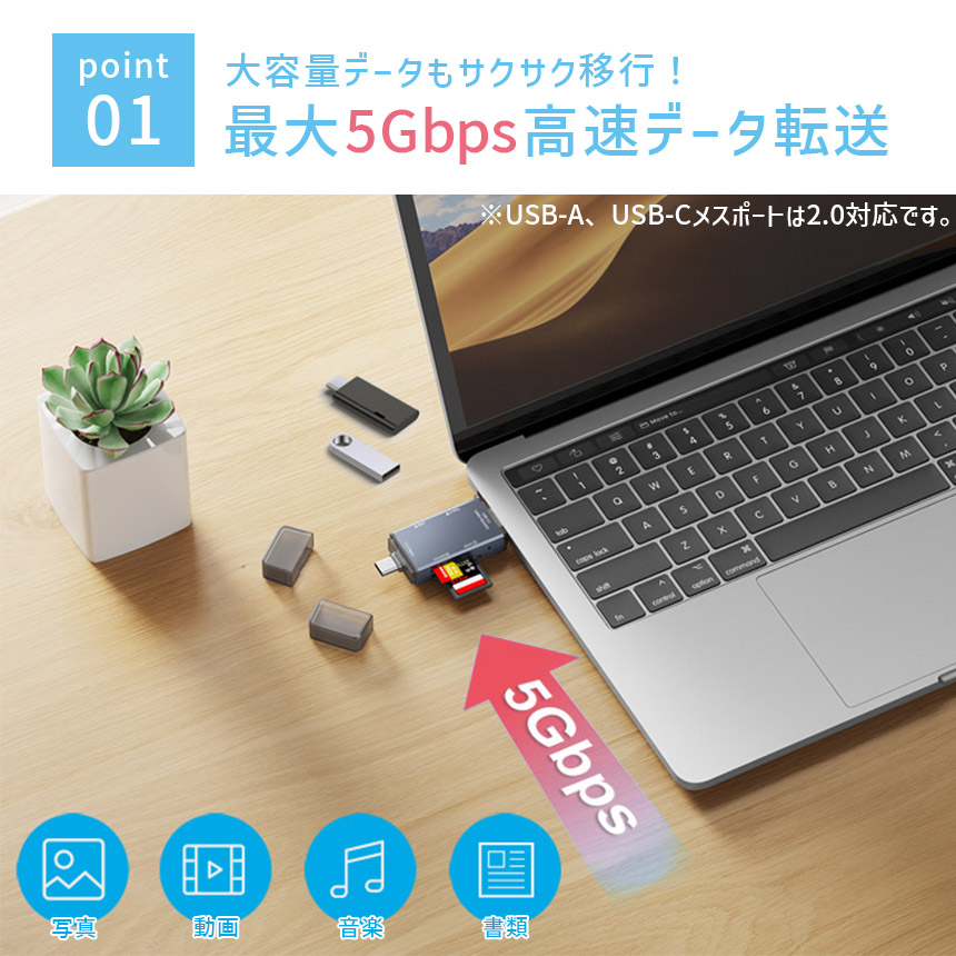 本製品にSDカード等の記憶媒体を差し込み、対応のデバイスと接続するだけで簡単に写真や動画、音楽などのデータを転送できます。