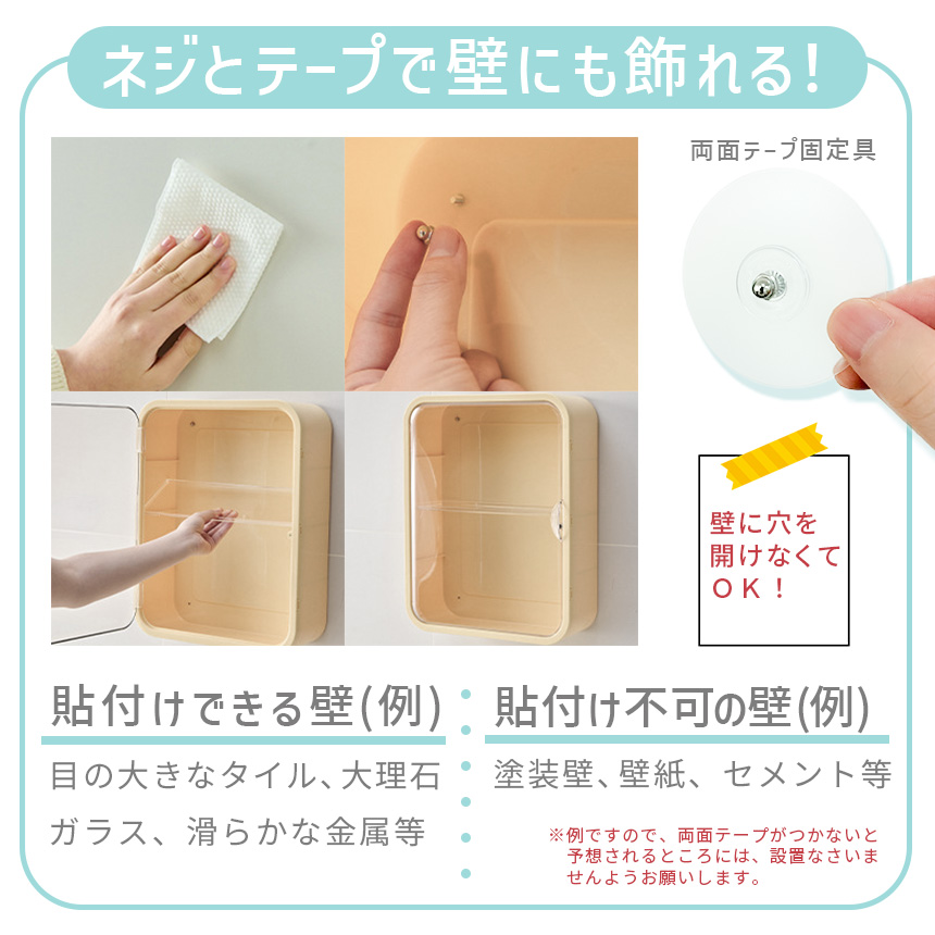 ・付属の固定具で、壁に貼り付けて使用することができます。(テープがしっかりつく壁でご使用ください。)