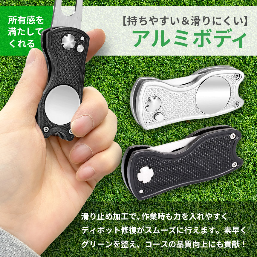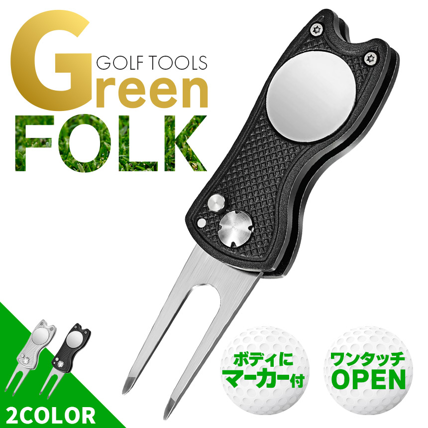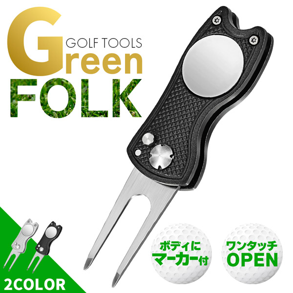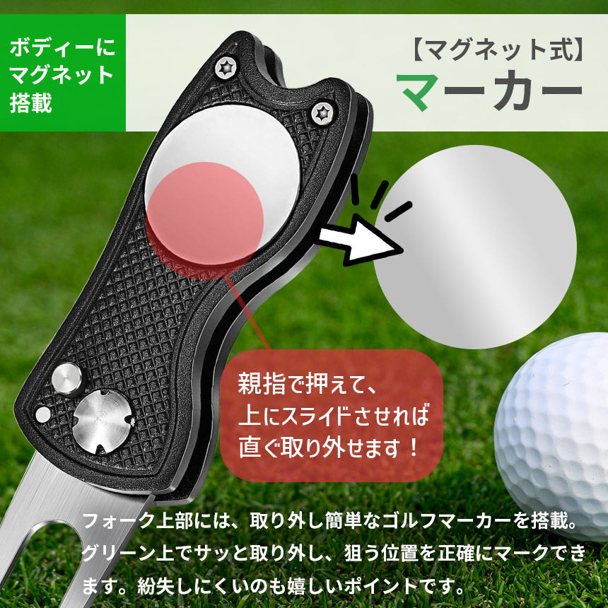 ゴルフ フォーク マーカー付き グリーンフォーク 折りたたみ マグネット式 マーカー付属 携帯便利 ディボット修復 ピッチマーク ブラック シルバー ゴルフアクセサリー 初心者〜上級者 スコアアップ マナー向上 ゴルフ用小物 ゴルフ用品