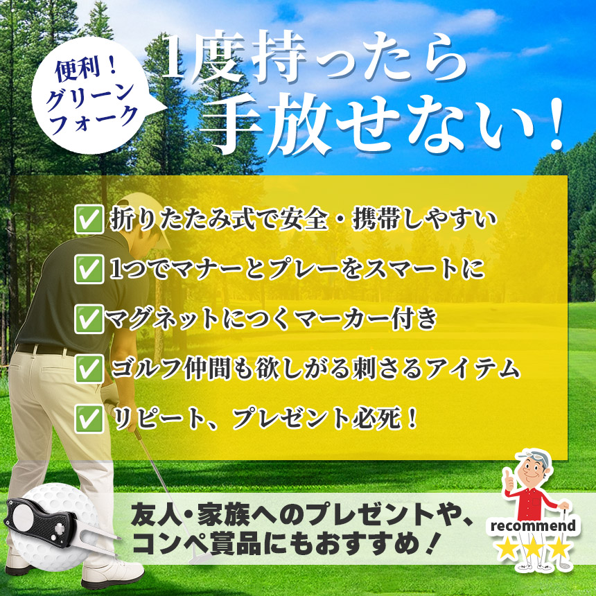 グリーン上のディボット補修と、パッティング時の位置マークがこれ1つで完結する便利なゴルフフォークです。初心者から上級者まで、持っているだけでスマートな振る舞いができる必須アイテムです。