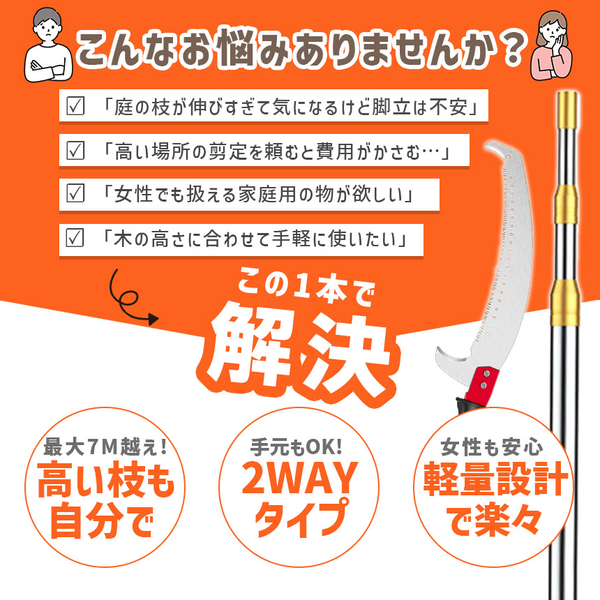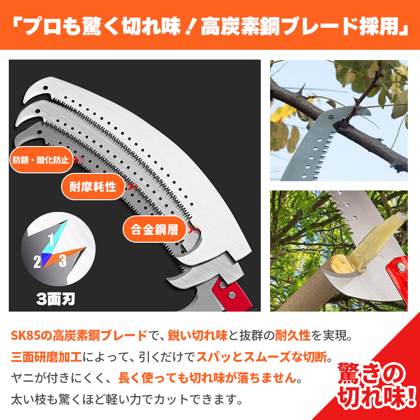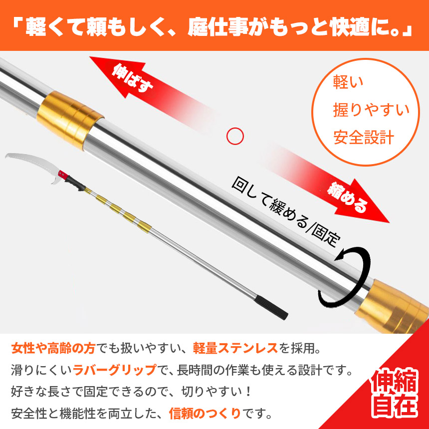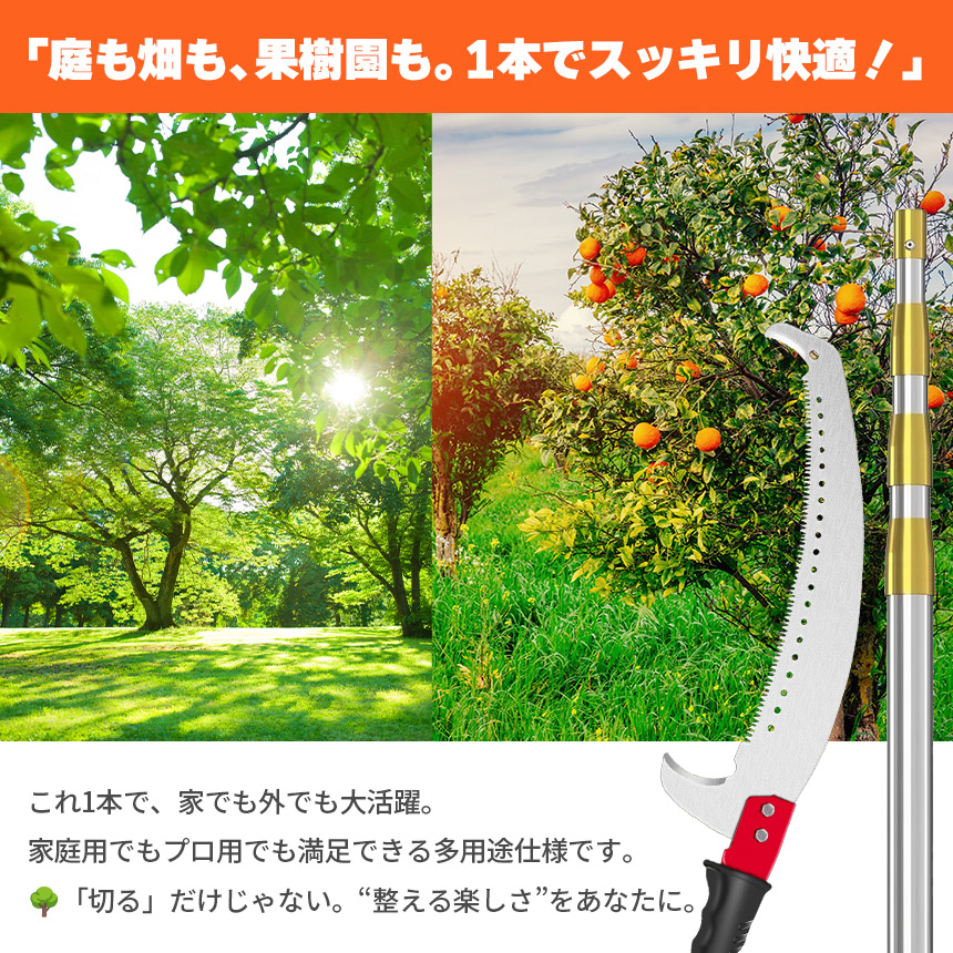 高所の枝を簡単・安全に切れる、伸縮式高枝ノコギリです。