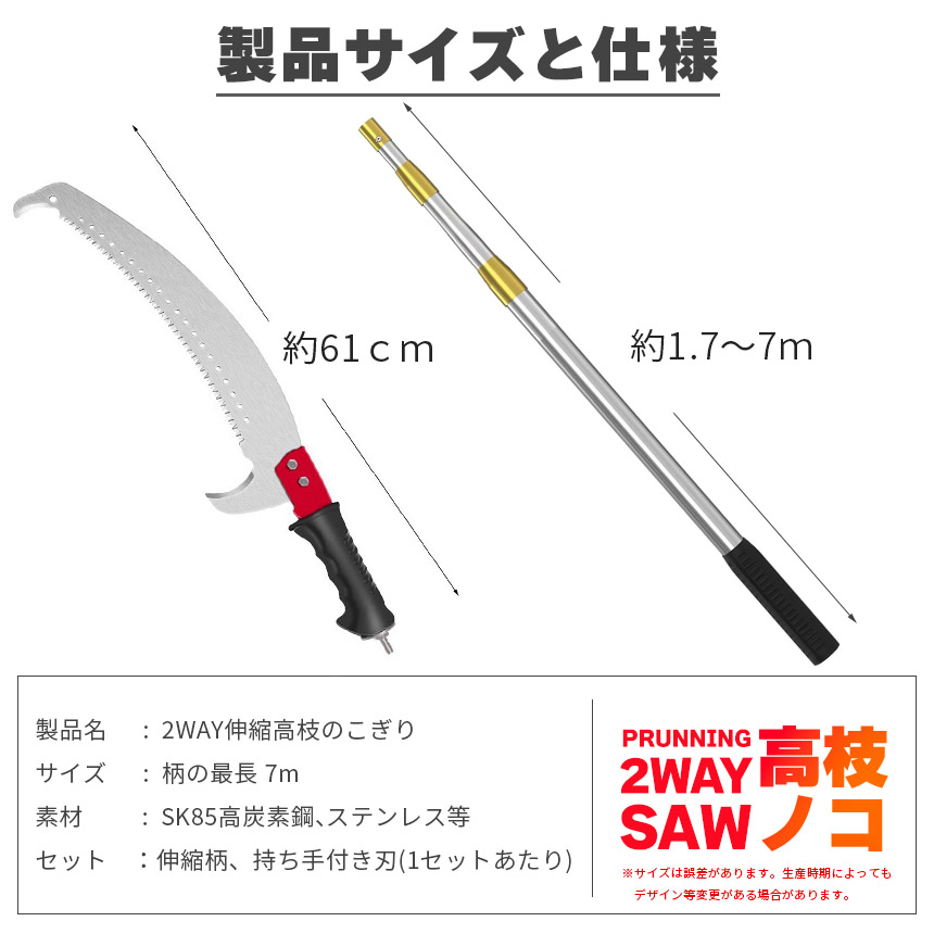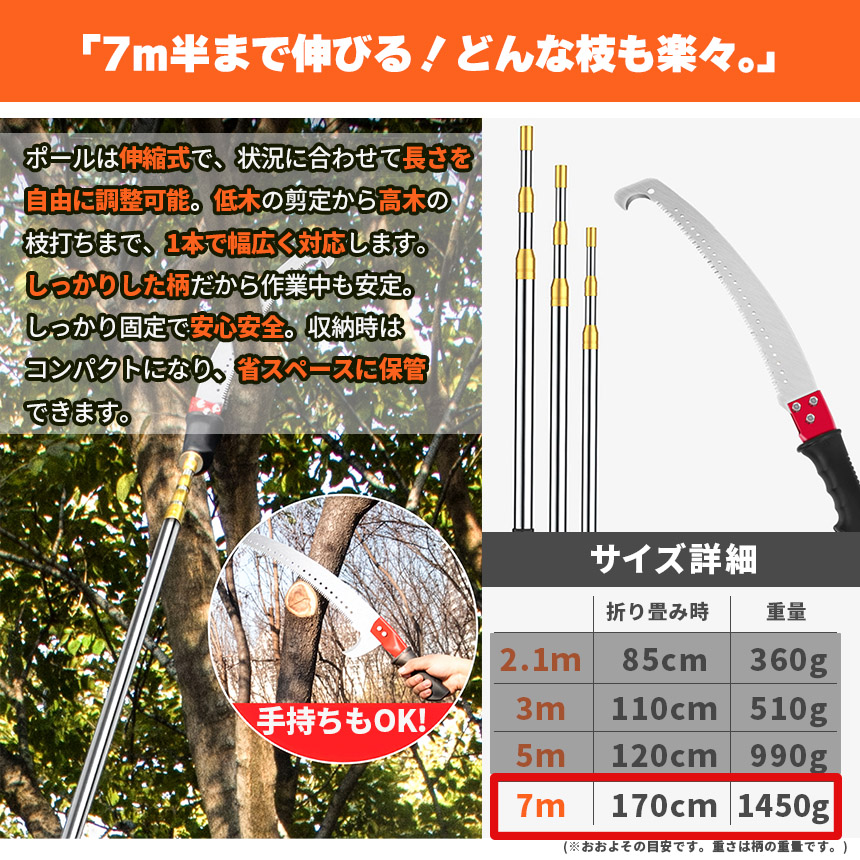 高枝ノコギリ 伸縮式 高枝切りノコ 切断のこぎり 高枝切りバサミ 高枝鋸 7m 伸縮ポール 枝切り 剪定 園芸用品 庭木 果樹 剪定のこぎり 高所作業 枝打ち 伐採 軽量 庭 手動剪定 ガーデニング用品