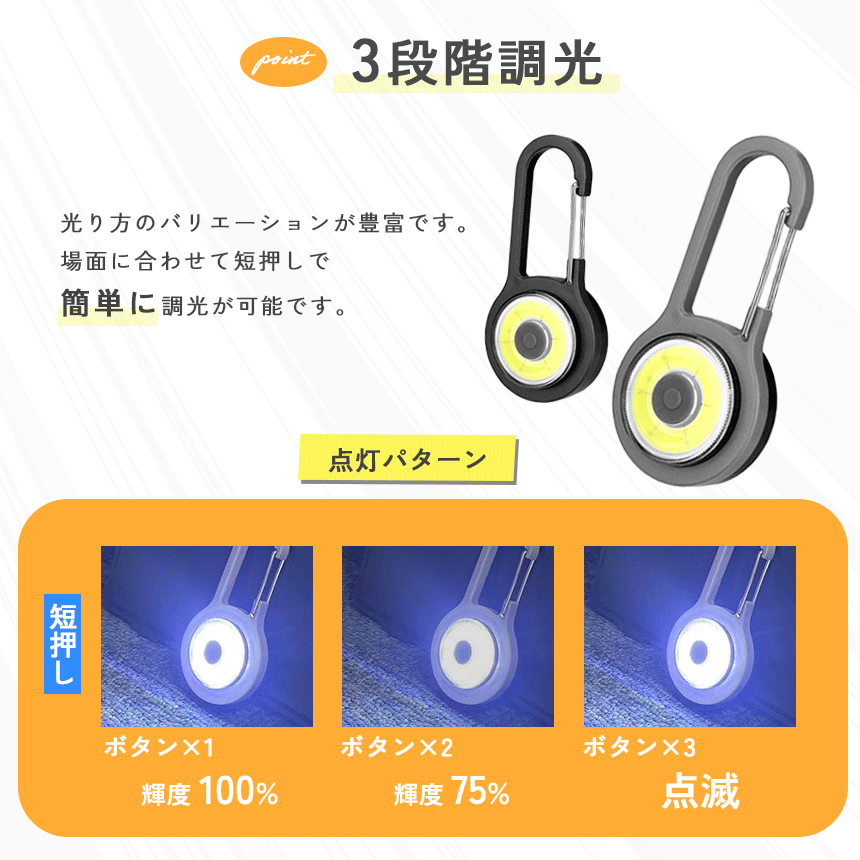 100%点灯・75%点灯・点滅の3モードを搭載。