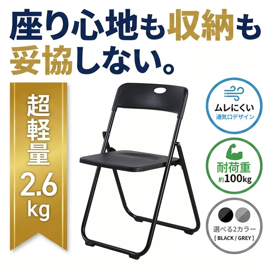 折りたたみチェア パイプ椅子 折り畳み椅子 コンパクト 軽量 約2.6kg 完成品 省スペース 取っ手付き スリム収納 来客用 会議用 イベント オフィス 家庭用 ブラック グレー イス 町内会 PTA 来客用 簡易 収納 スポーツ観戦 パイプイス