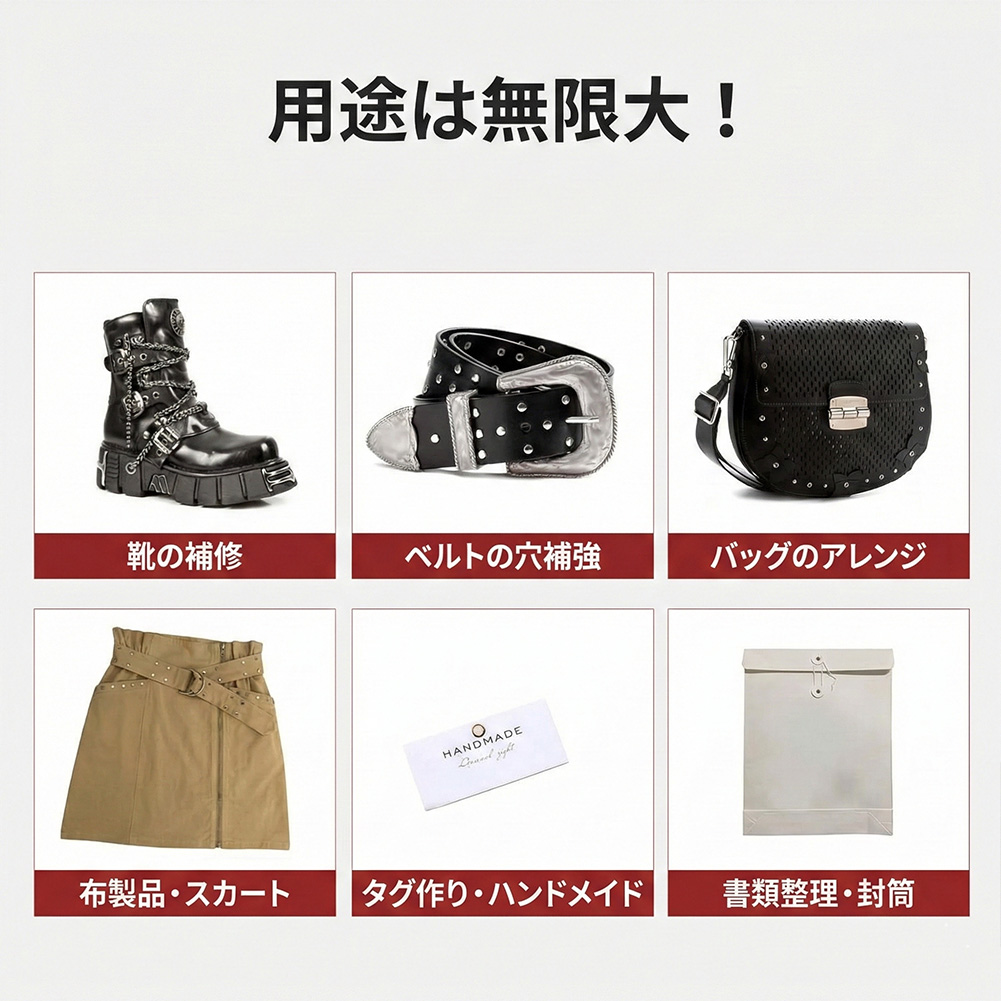 ・ファッション小物:靴紐の穴(アイレット)の補修、ベルトの穴補強に。