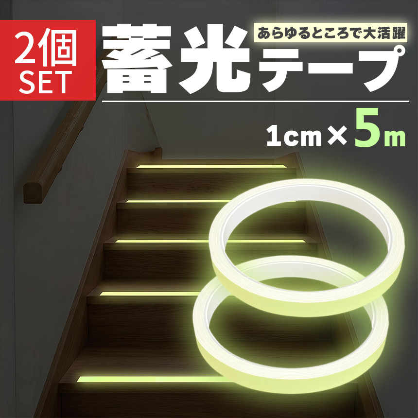2個セット 蓄光テープ 1cm幅 穏やかな発光 目印 夜光テープ 防災 階段 段差 廊下 転倒防止 停電 避難 強力粘着 DIY シール 蛍光テープよりも優しい光 インテリア 介護 子ども ペット 安心 安全 夜間の目印に最適 眩しすぎないソフトな輝き