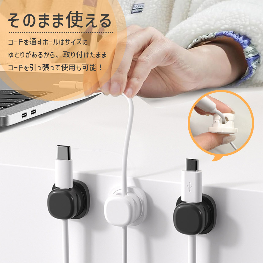 この製品はコードを壁や机などにサッと固定して置ける便利アイテムです!
